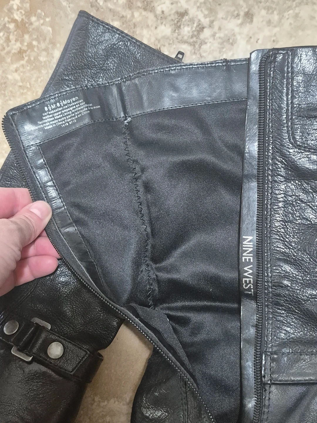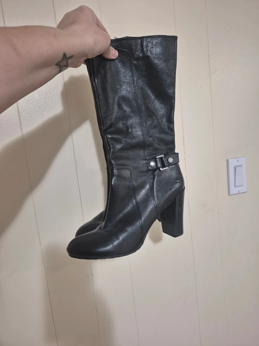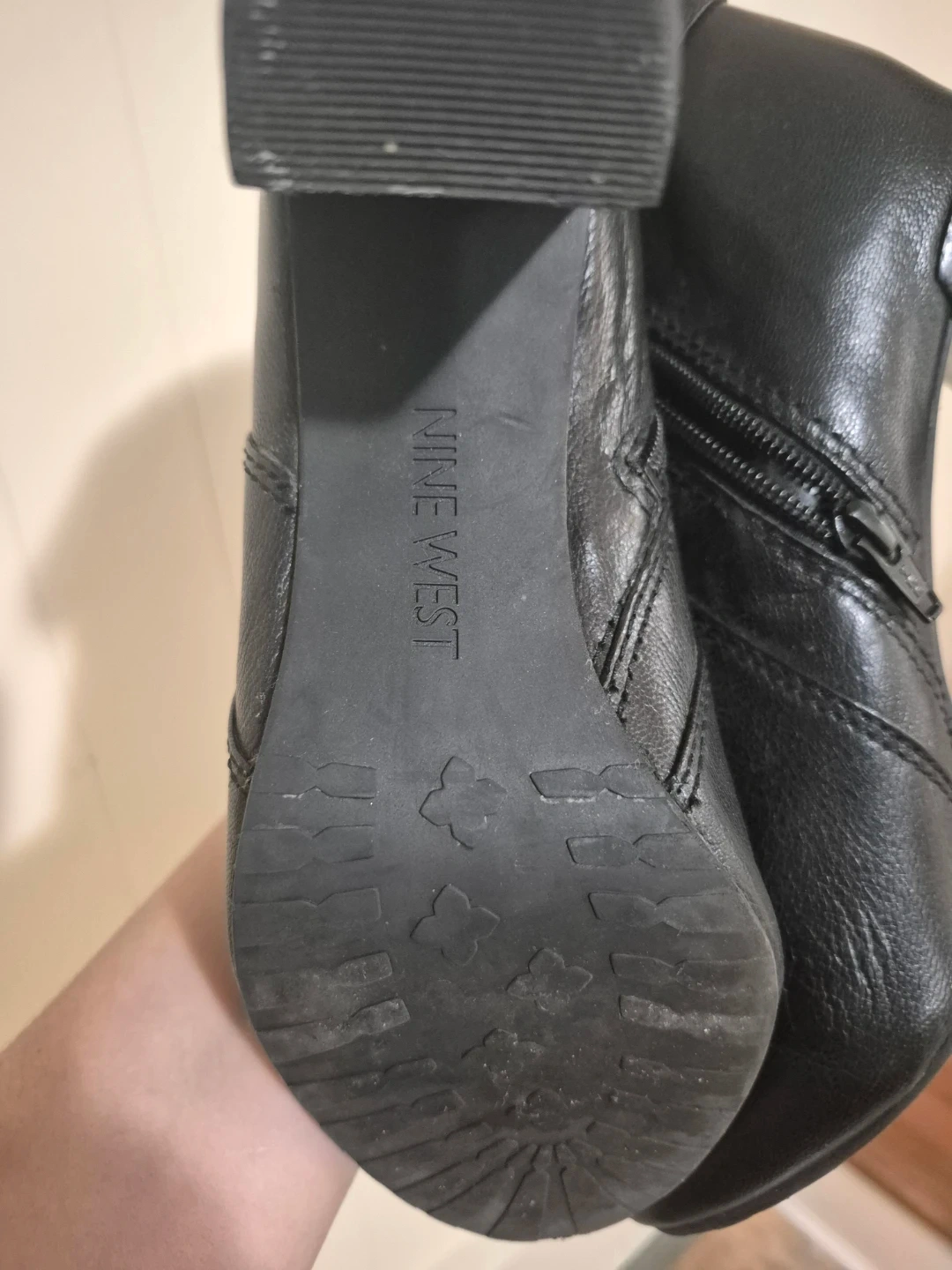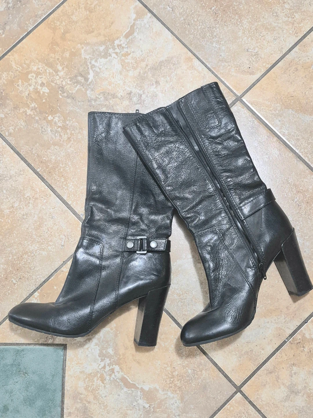 Black leather boots by Nine West. Features a side zipper closure and buckle detail. Block heel design.