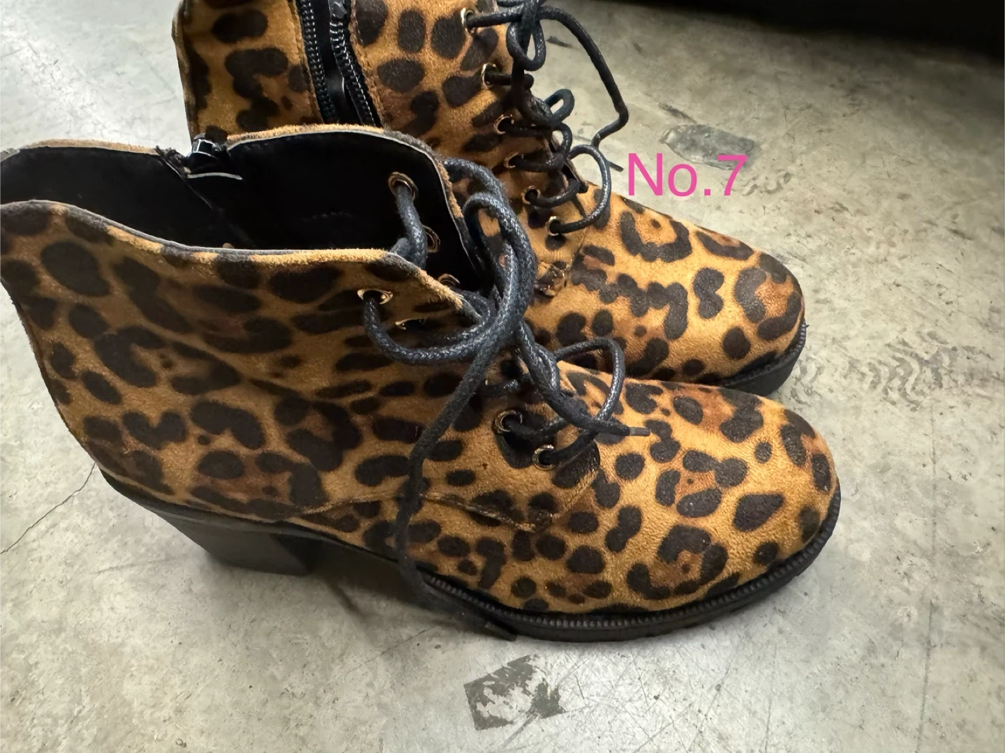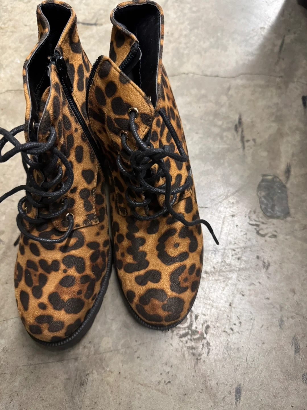 Selling a pair of gently used leopard print ankle boots. They feature a lace-up front and a side zipper for easy wear. Perfect for adding a touch of wild style to any outfit!
