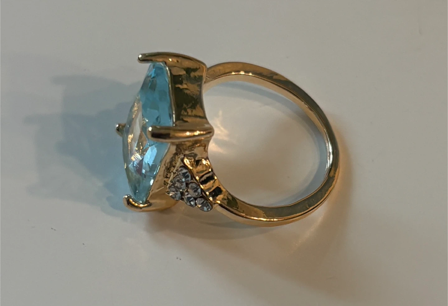 This beautiful ring features a large, light blue marquise-cut stone set in a gold-tone band. Small clear stones accent the sides of the setting. It's a stylish piece for any occasion!