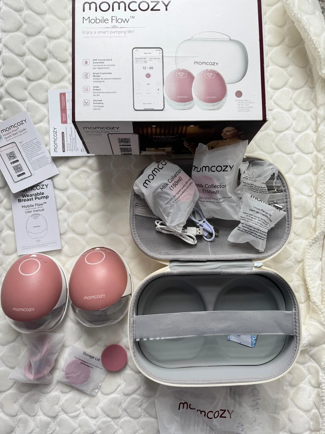 This Momcozy Mobile Flow breast pump is wearable and comes with app connectivity. It includes two milk collectors (150ml each), USB charging cables, and storage lids. This set is pink and includes a charging case.
