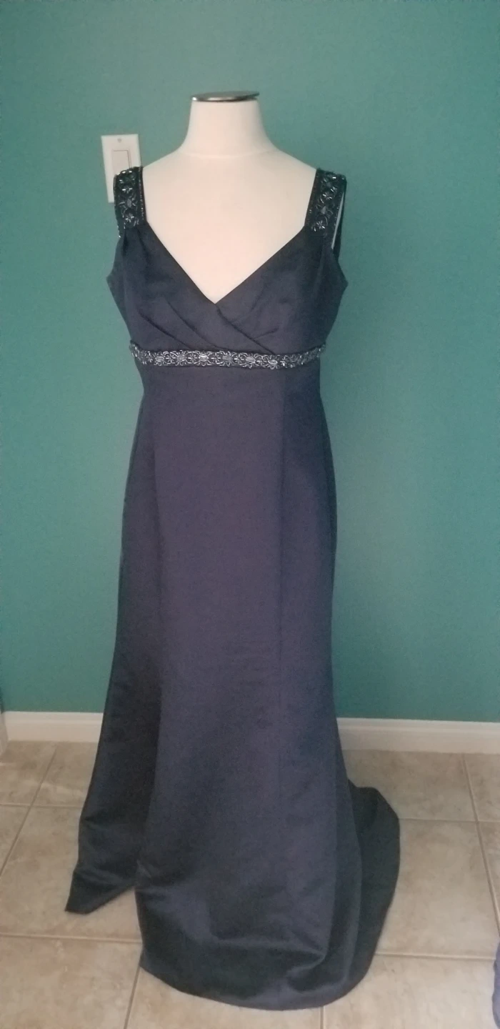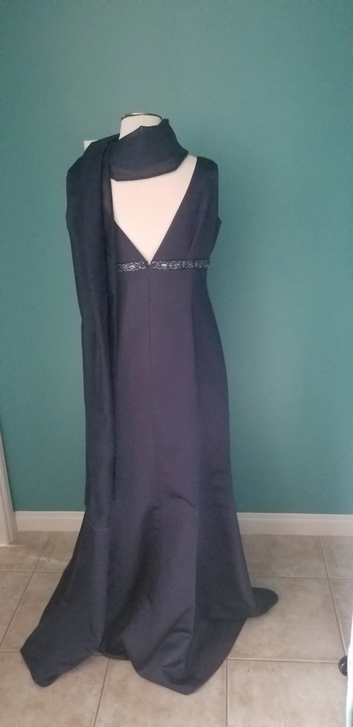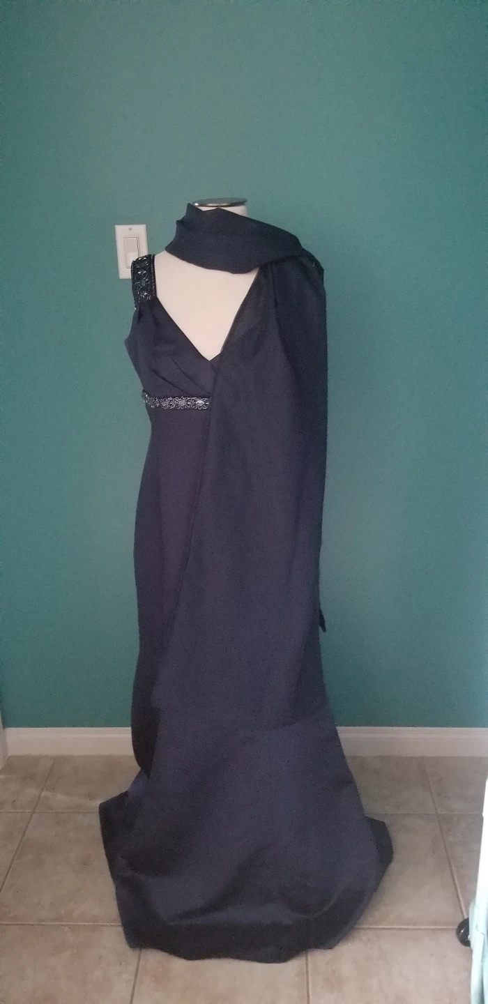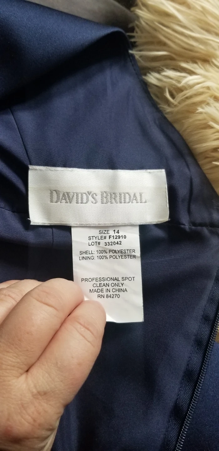 Blue dress, size 14 from David’s Bridal. Only worn once and comes with the scarf which can be worn with or without the dress.