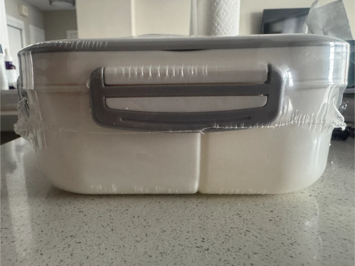 This is a Chaozhenmei lunch box with a grey and white design. It has a secure locking lid and internal compartments for food separation. It's suitable for packing meals for work or school.
