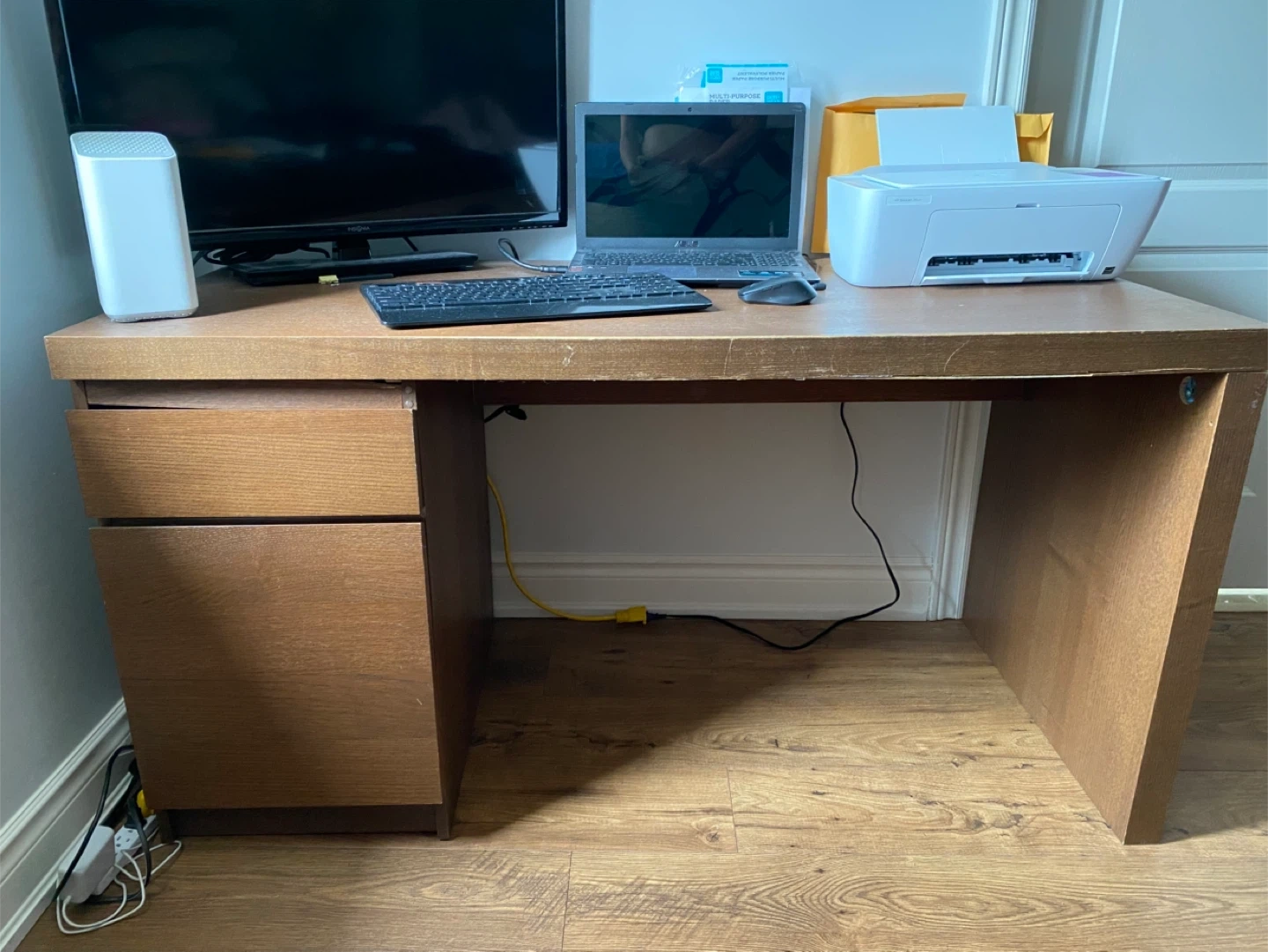 This desk features a light brown wood grain finish. It includes two drawers on the left side for storage. It's a solid piece of furniture perfect for a home office.