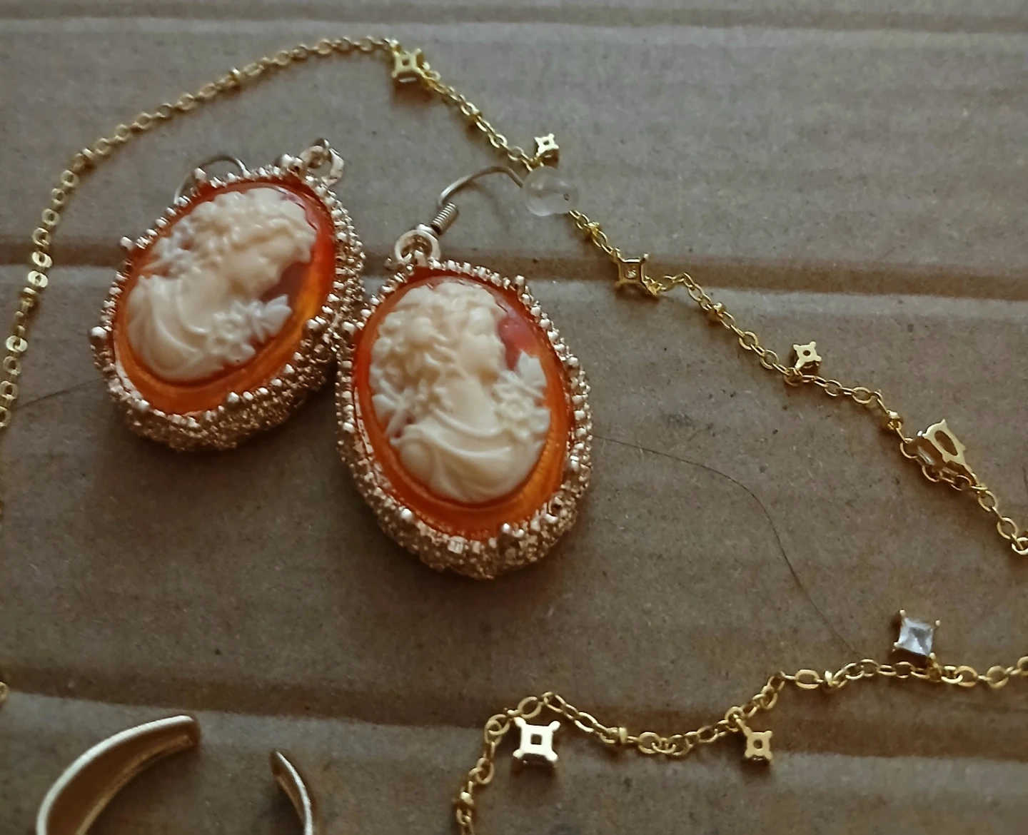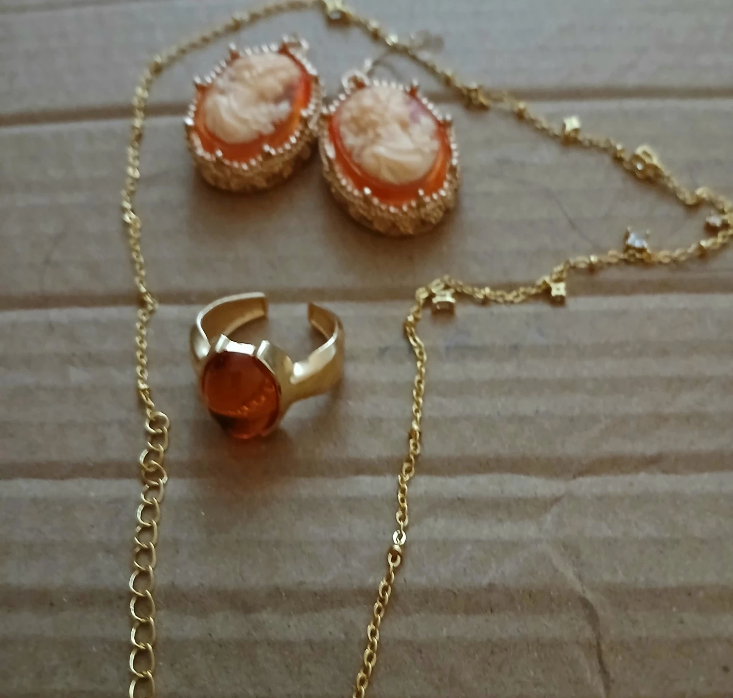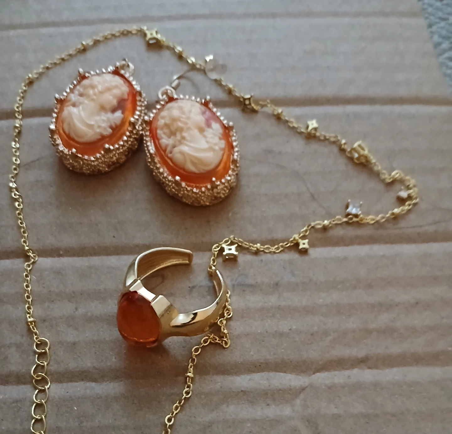 Selling a beautiful cameo jewellery set! Includes a necklace, ring, and earrings with a gold-tone finish. Perfect for adding a touch of vintage elegance to any outfit