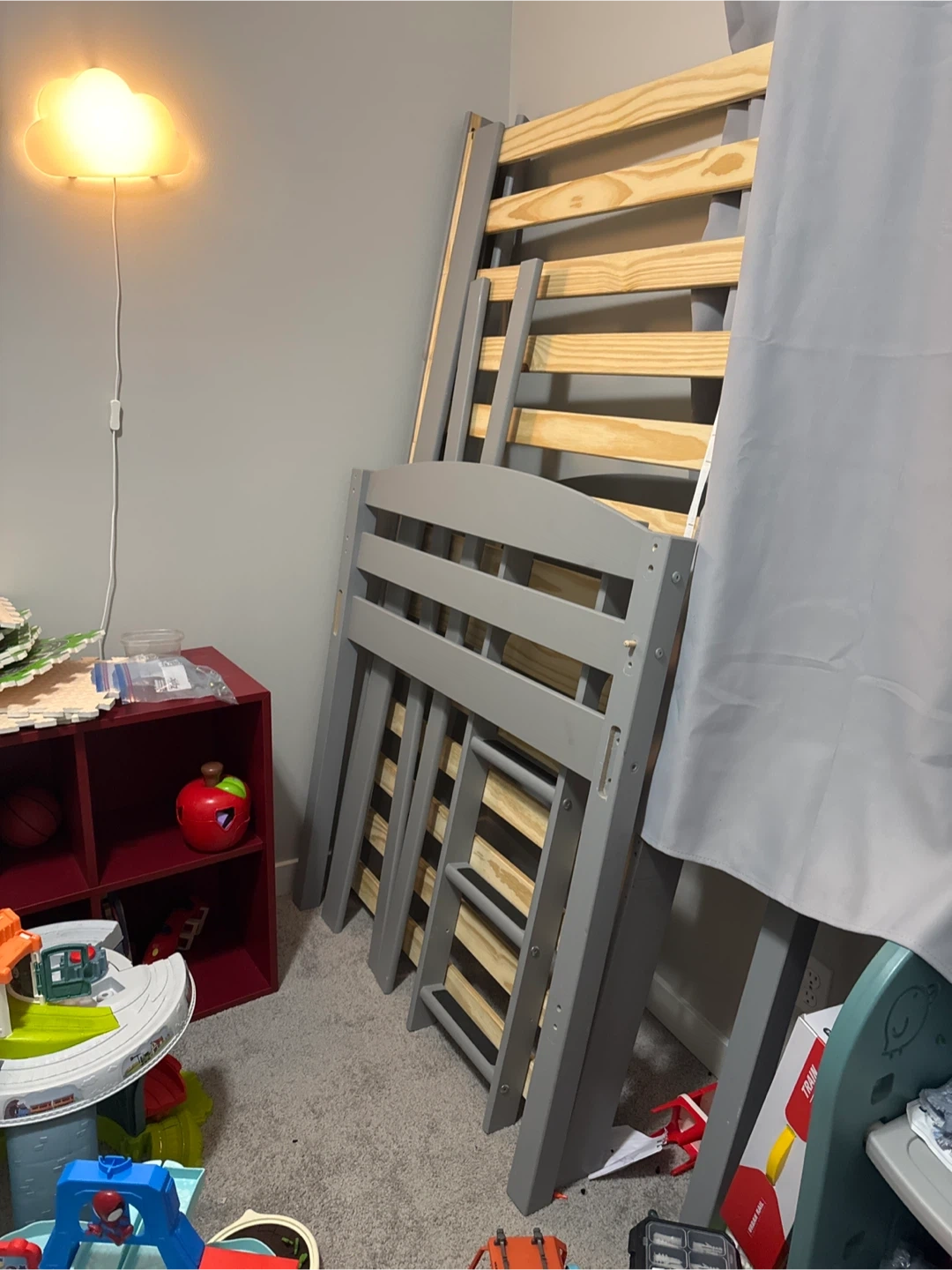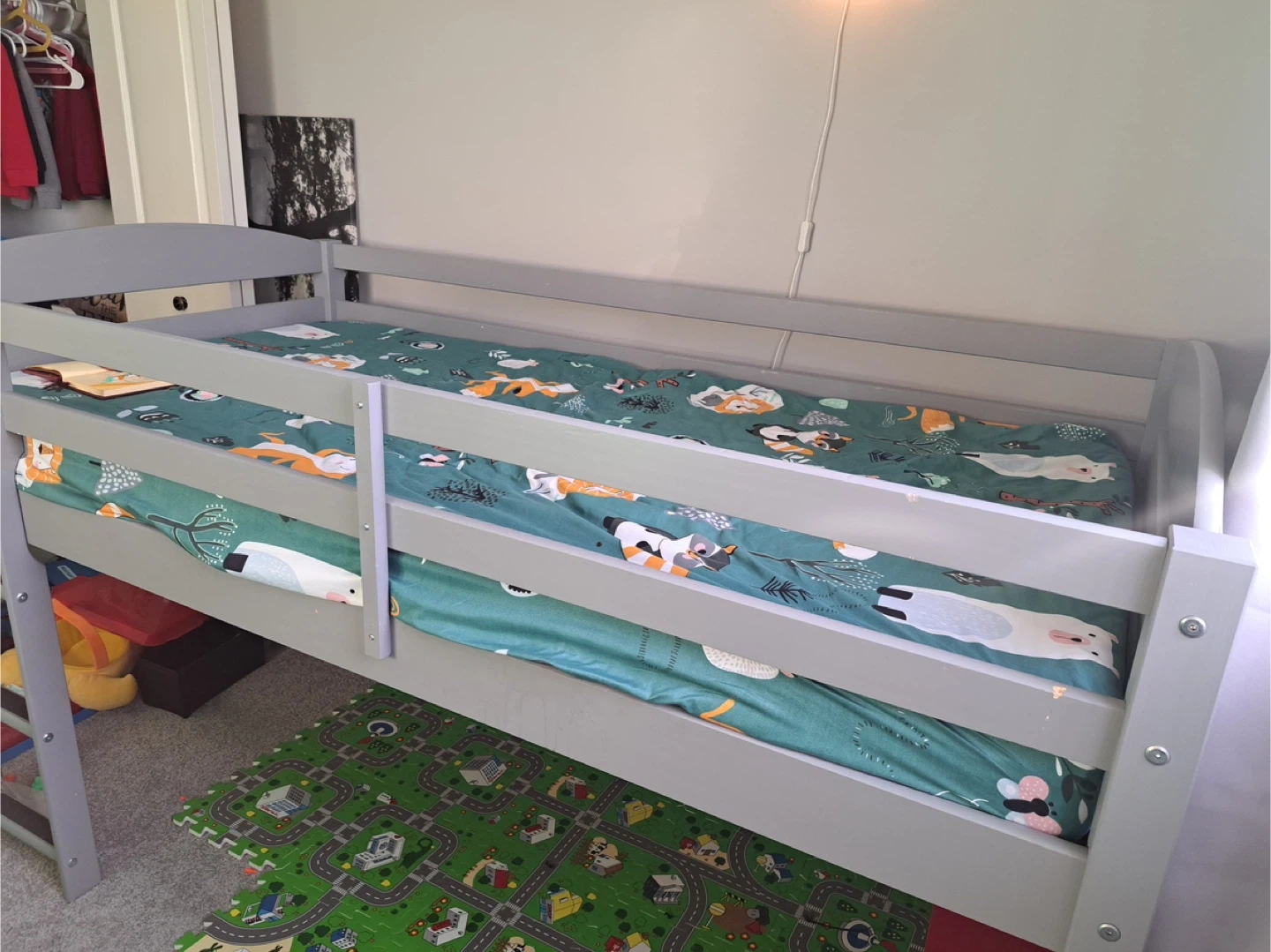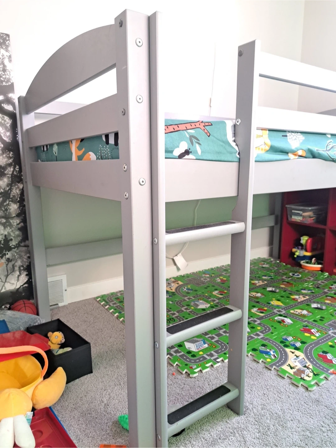 This loft bed frame is a junior loft bed made of grey wood. It's designed for a child's room. The ladder provides easy access to the sleeping area. Lots of space saving. Mattress not included. Twin size.