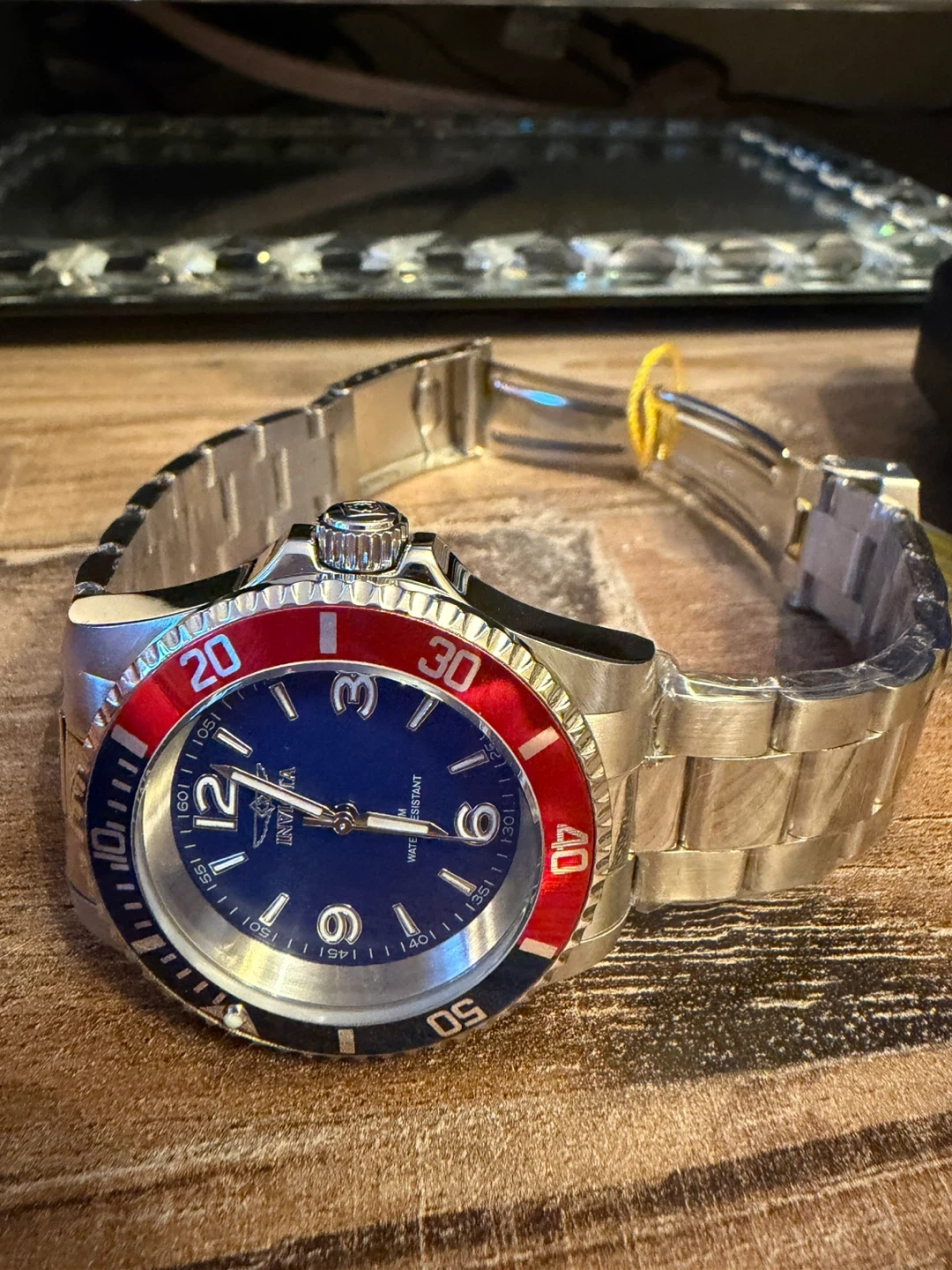 This Invicta Specialty watch features a blue dial and a red and blue rotating bezel. Stainless steel band and case. Water resistant. Brand new .