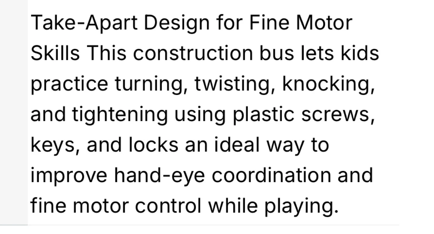 This yellow school bus toy features a take-apart design with screws, nuts, and tools for kids to assemble and disassemble. It includes Phillips and slotted screwdrivers, a hammer, and a wrench, promoting fine motor skills and problem-solving. Recommended for ages 3 and up. Priced to sell close to the border of Brampton and Caledon. - Kennedy and Mayfield is the main intersection.