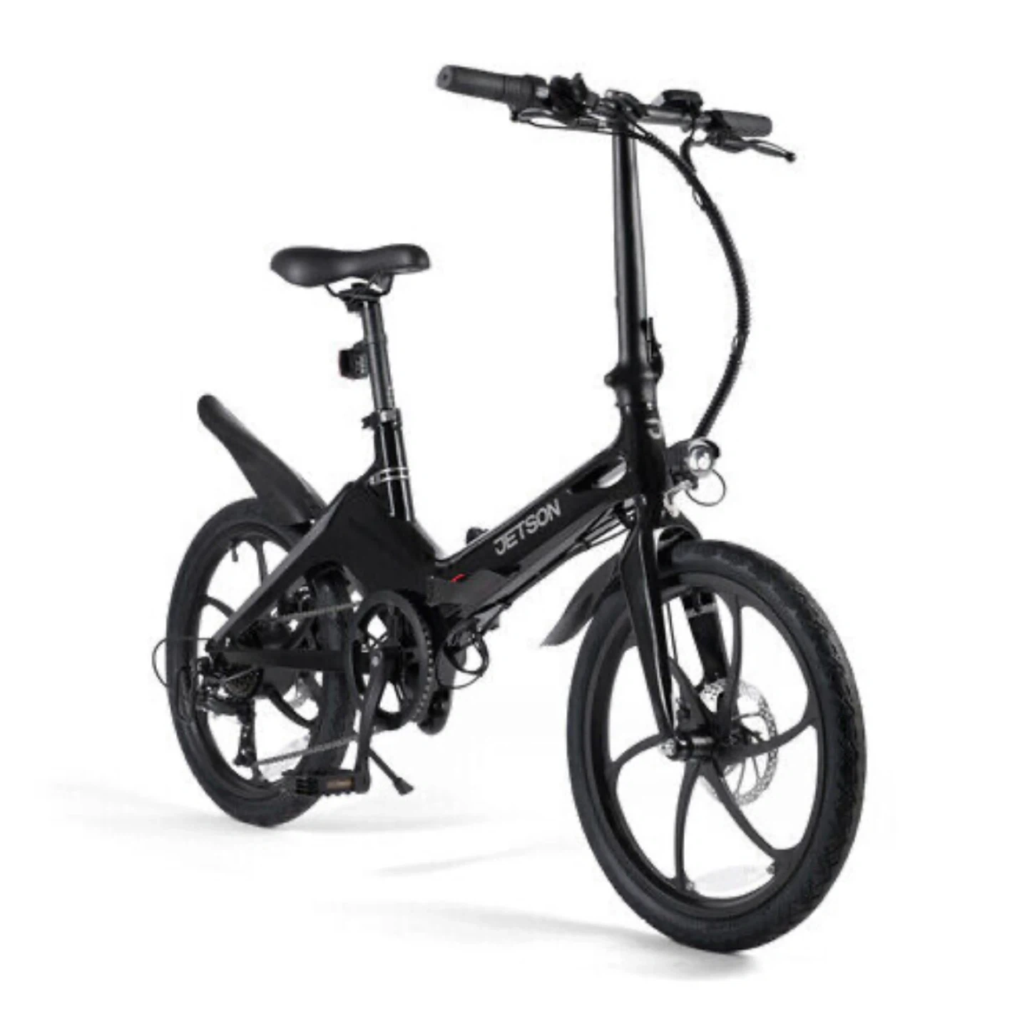 This is a Jetson folding electric bike. It features a red frame and black accents. It's designed for convenient urban commuting.