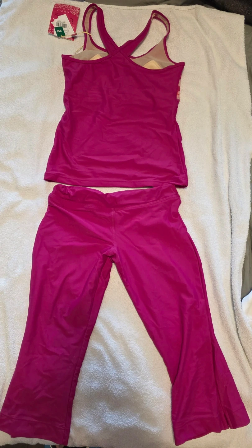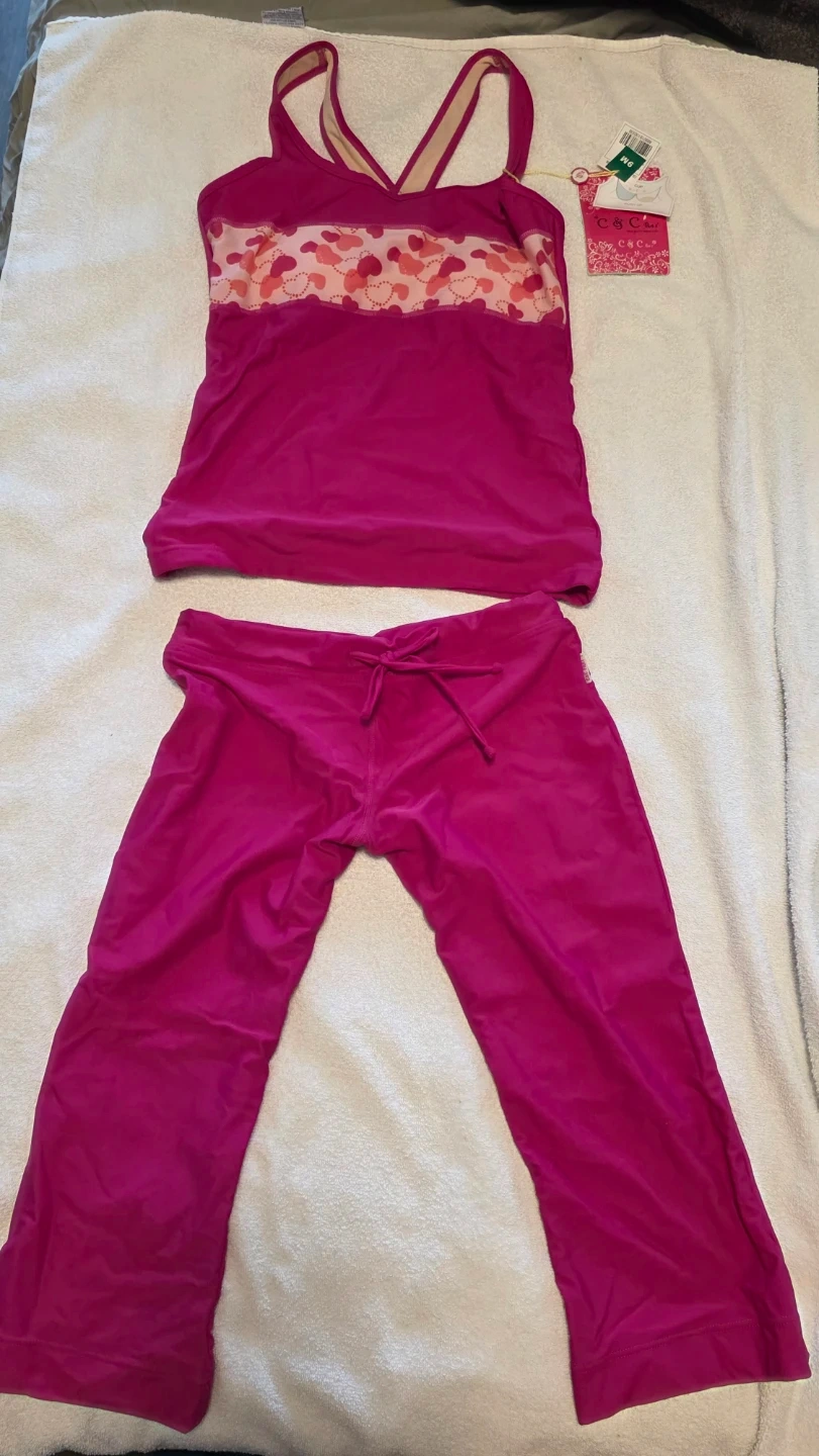 This C&C California swim set features a pink tankini top with a cute heart print across the bust. It's paired with matching pink bottoms that have a drawstring waist. It's perfect for a day at the beach or pool!