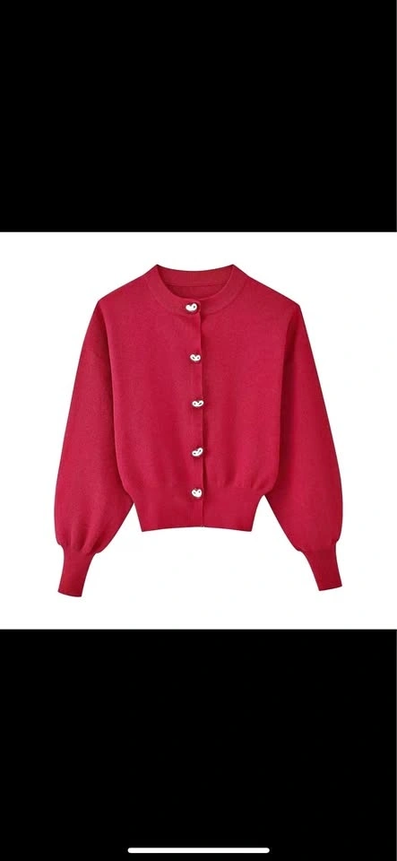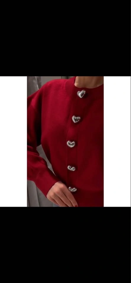 Beautiful red knit cardigan featuring unique silver heart-shaped buttons. Soft, comfortable fabric with a slightly cropped fit and subtle puff sleeves for a flattering silhouette. Perfect for casual wear, work outfits, or dressing up with jeans or skirts.