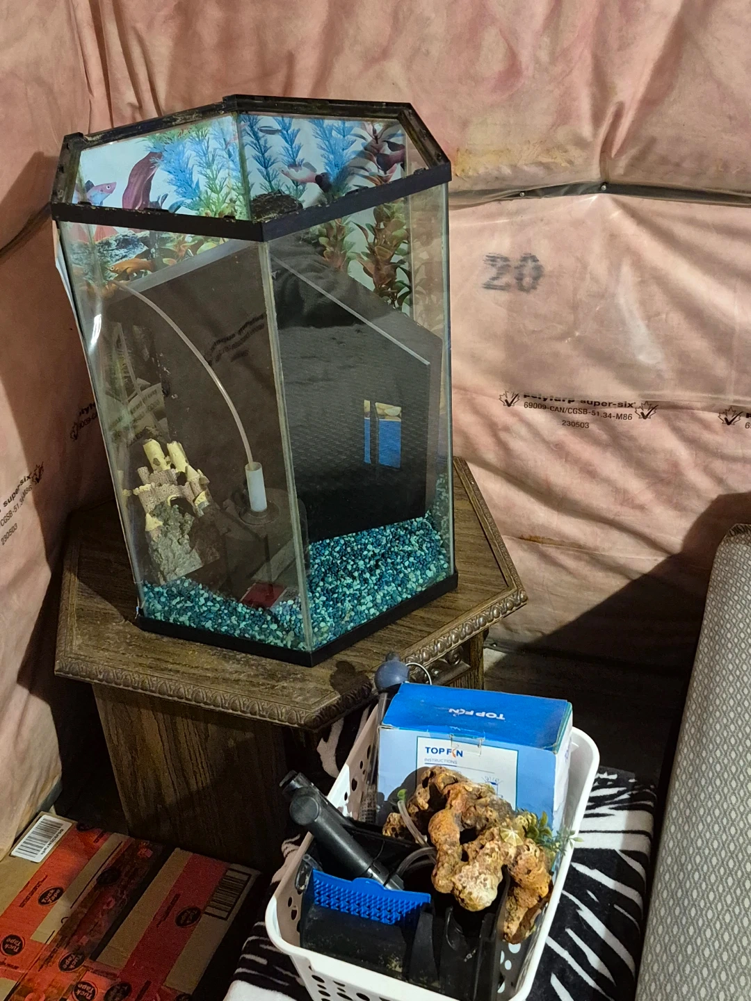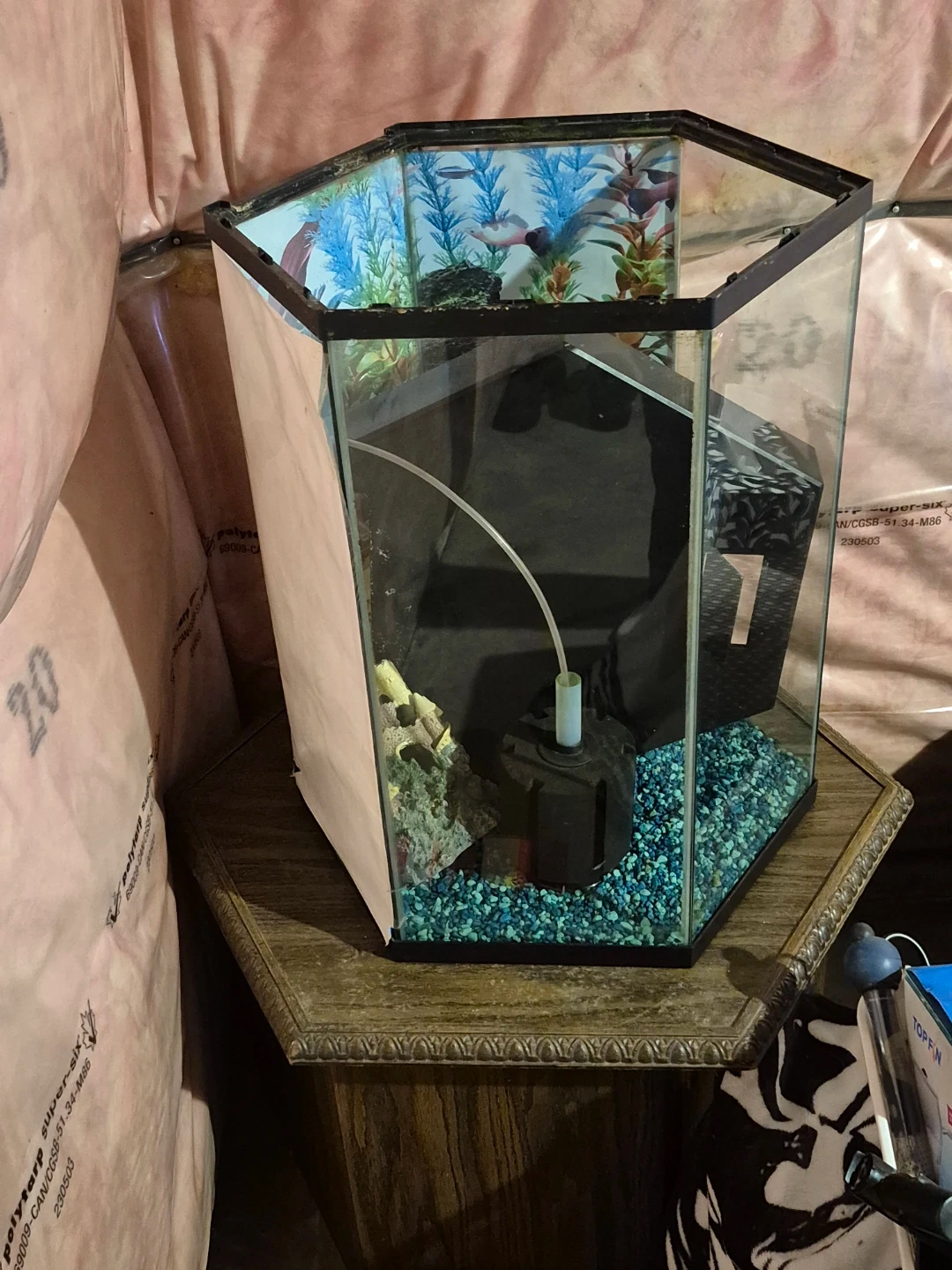 This is a hexagonal glass aquarium tank. It includes gravel, a filter, and some decorative elements. It's suitable for small fish or as a starter tank. Comes with a year worth of filters and everything you need just add water and fish. 150 or shoot me an offer