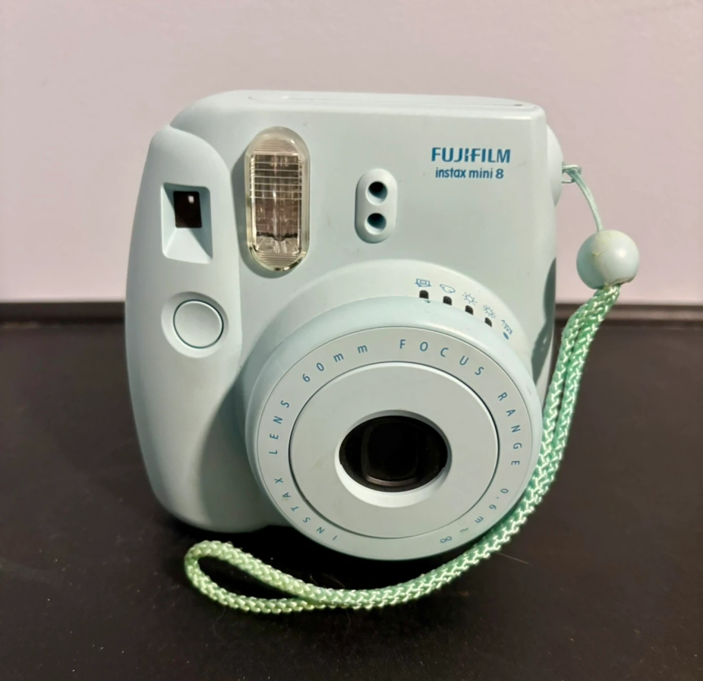 Fujifilm Instax Mini 8 instant camera in a light blue colour. It's ready to capture memories on the go. Features a 60mm lens and a built-in flash.
