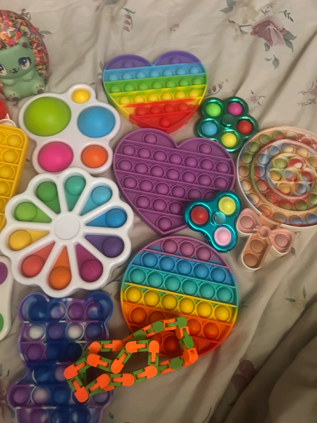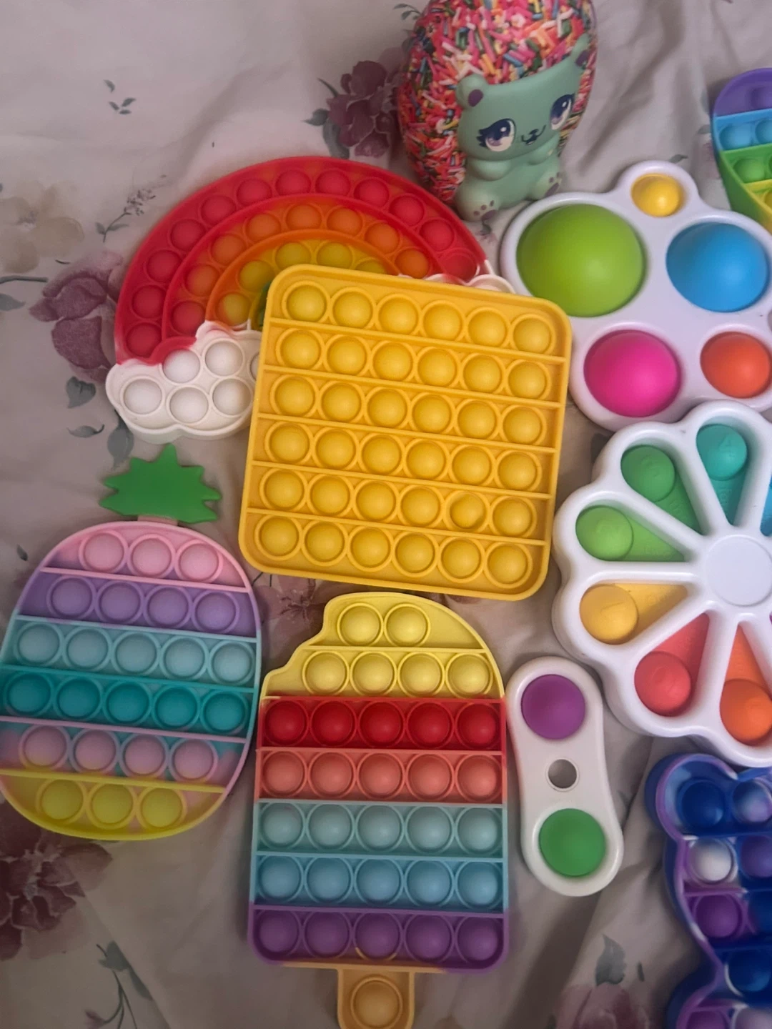This is a collection of various pop-it and fidget toys. Includes multiple shapes like hearts, circles, and ice cream pops. Made of silicone and plastic materials.