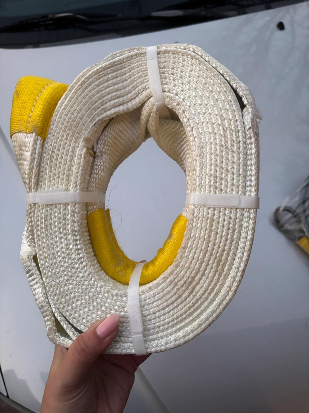 Selling a tow rope in new condition! It's white with yellow accents and appears to be made of a strong, woven material. Perfect for anyone needing a reliable tow rope for their vehicle
