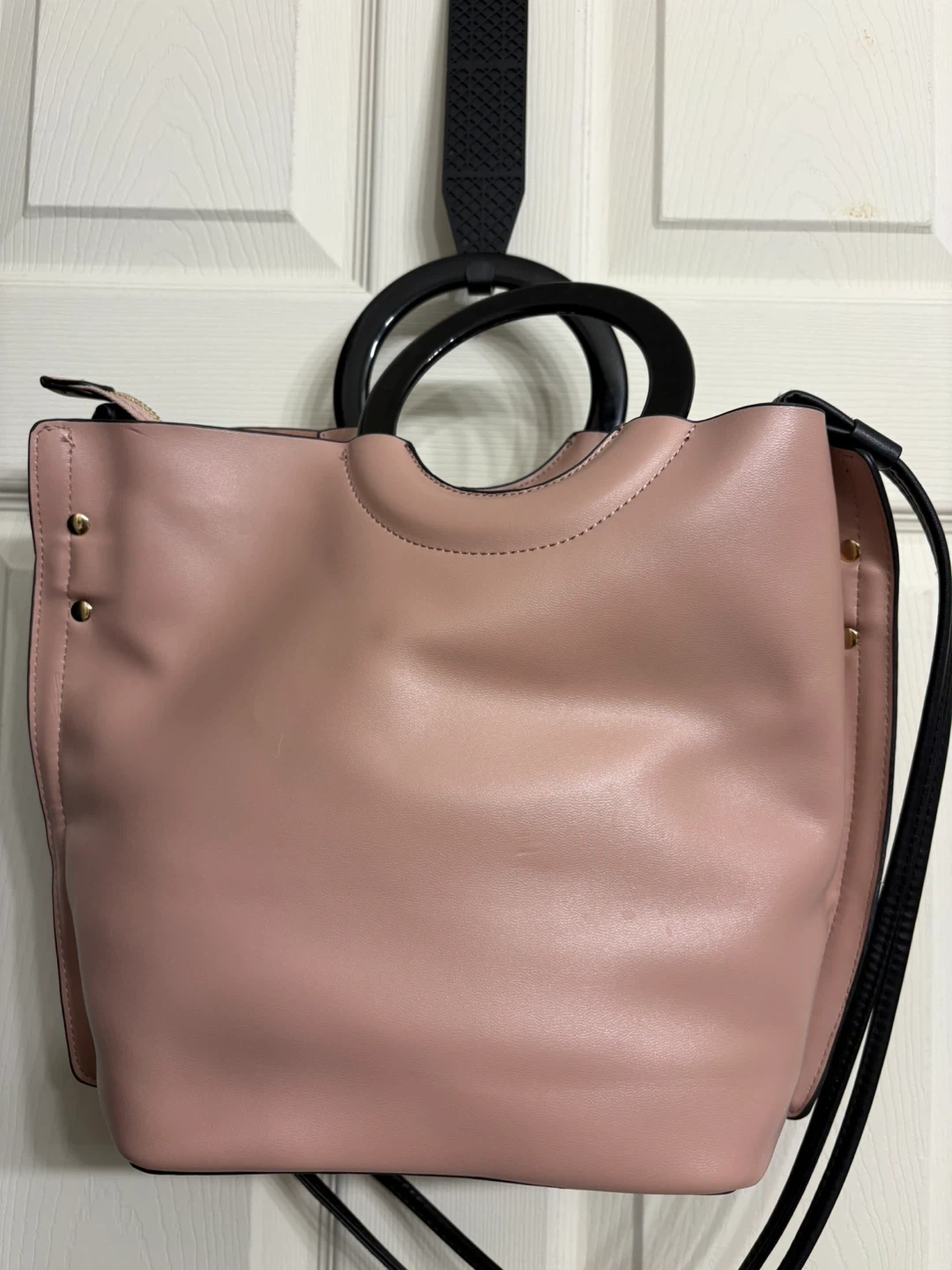 This Izzy & Ali handbag is a lovely shade of pink. It's made from genuine leather and features stylish black round handles. This bag is in perfect new condition, never been used! A leather strap is included, so it can be used as a shoulder bag as well! Pick up in Chestermere.