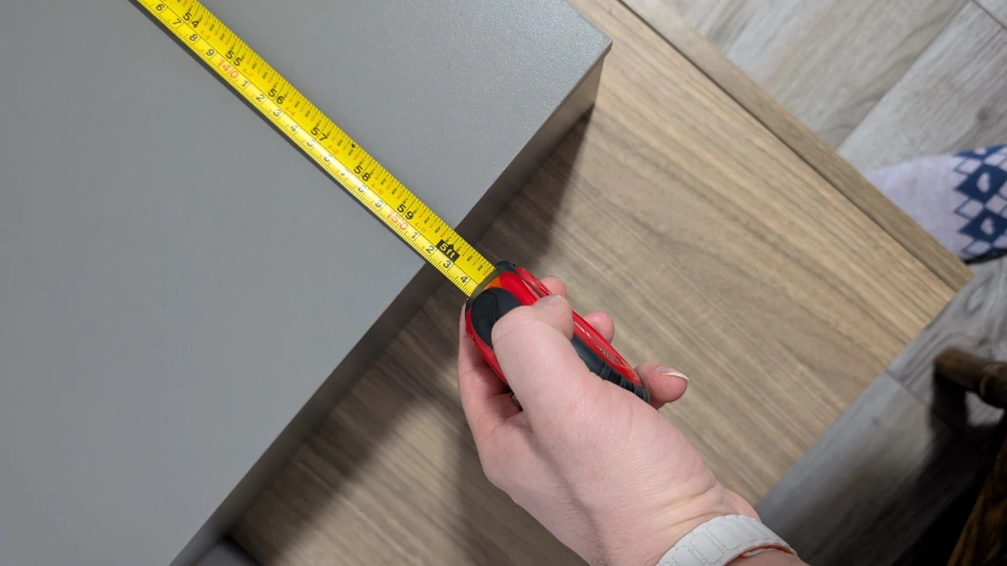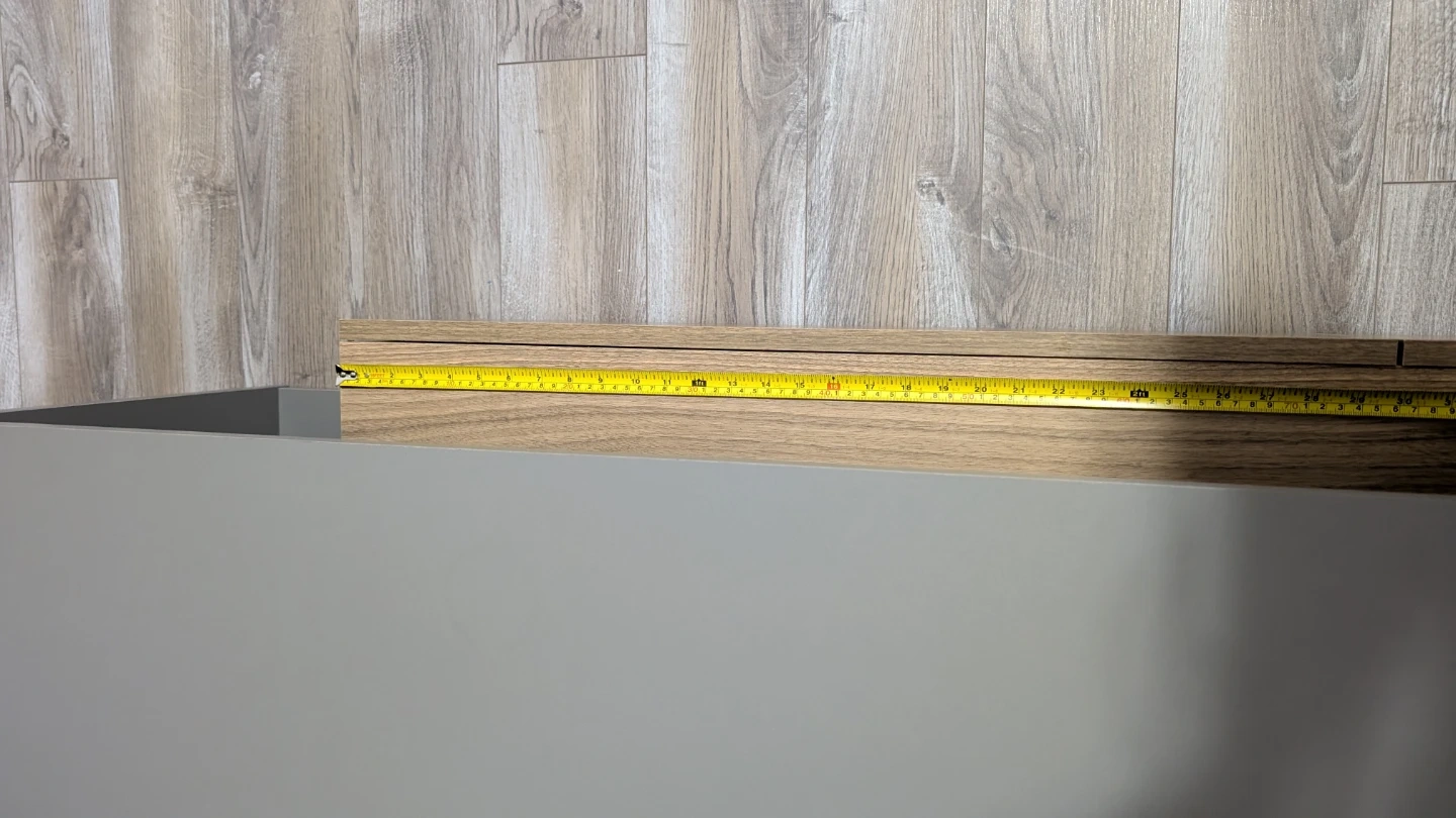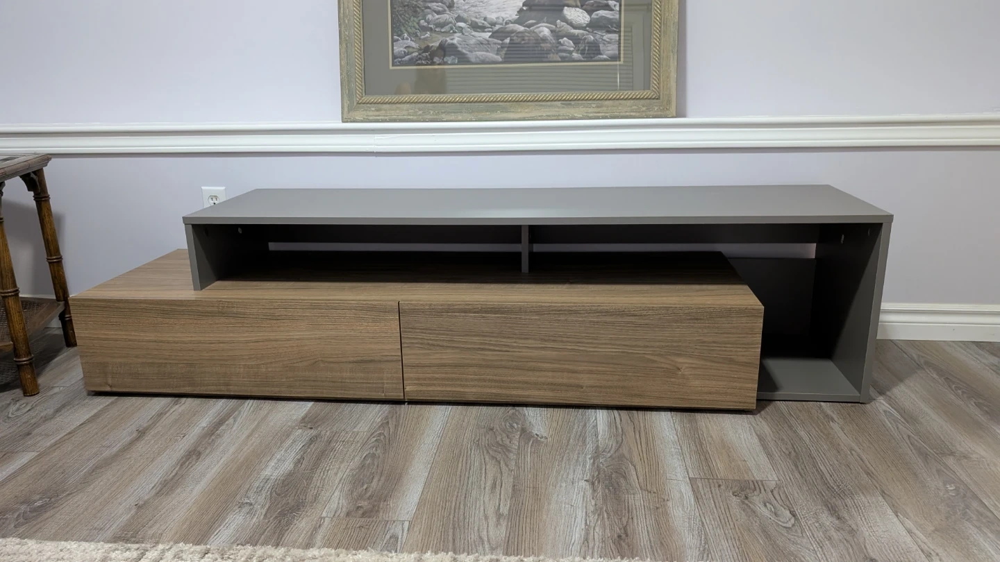 This modern TV console grey top surface and wood-grain drawers. It measures approximately 71 inches in length. It has two drawers and an open shelf compartment.