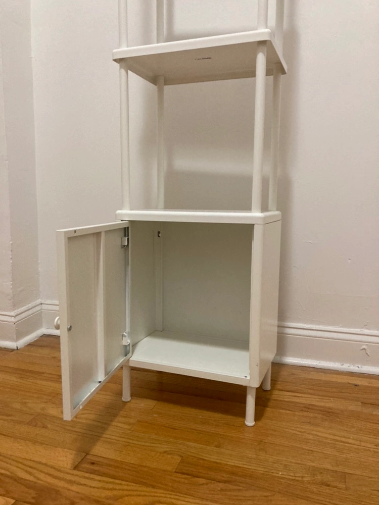Tall metal off white modern bookshelf in like-new condition! Has cabinet. See photos for details. 7/28 preferred pickup