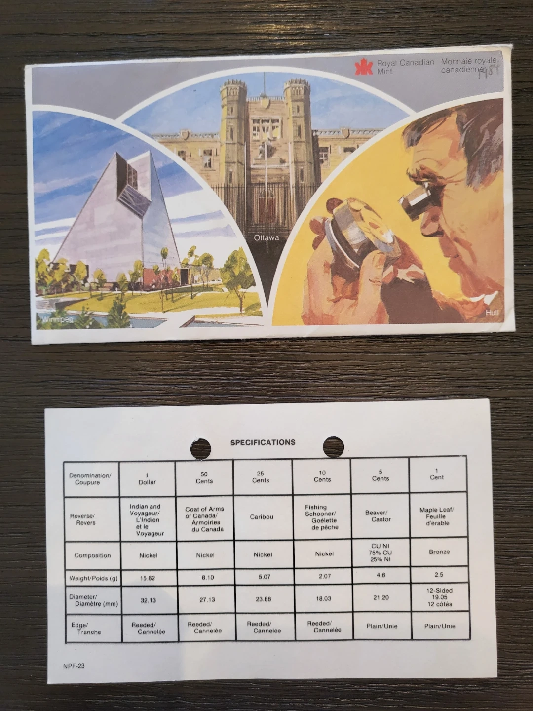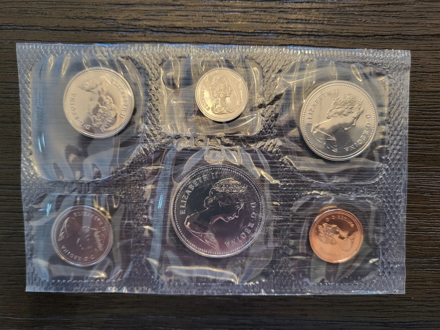 1984 Royal Canadian Mint (RCM) Uncirculated Coin Set. Still sealed in its original packaging, this set includes a dollar, 50-cent piece, 25-cent piece, 10-cent piece, 5-cent piece and a 1-cent piece.