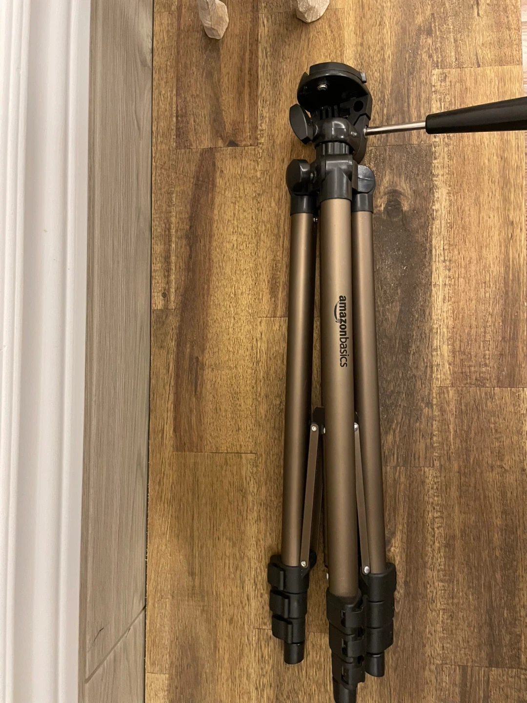 AmazonBasics tripod in a bronze colour. It's made of metal and plastic. This tripod is great for taking stable photos and videos. Barely used.