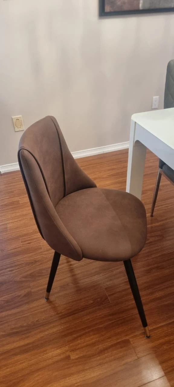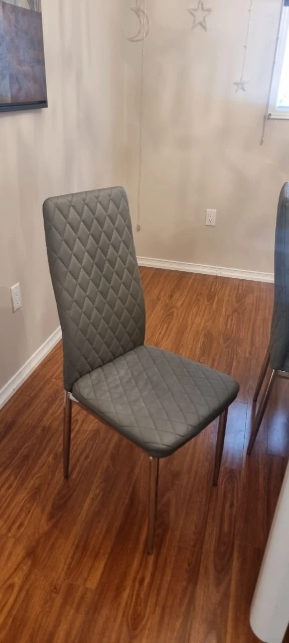 Six upholstered dining chairs with diamond tufting. Chairs feature sleek, modern metal legs. They're comfortable for long meals. This set would suit a dining room or kitchen table.