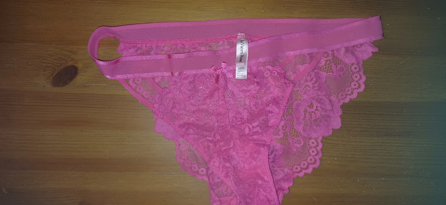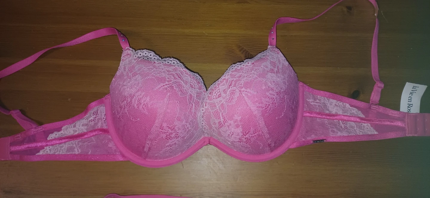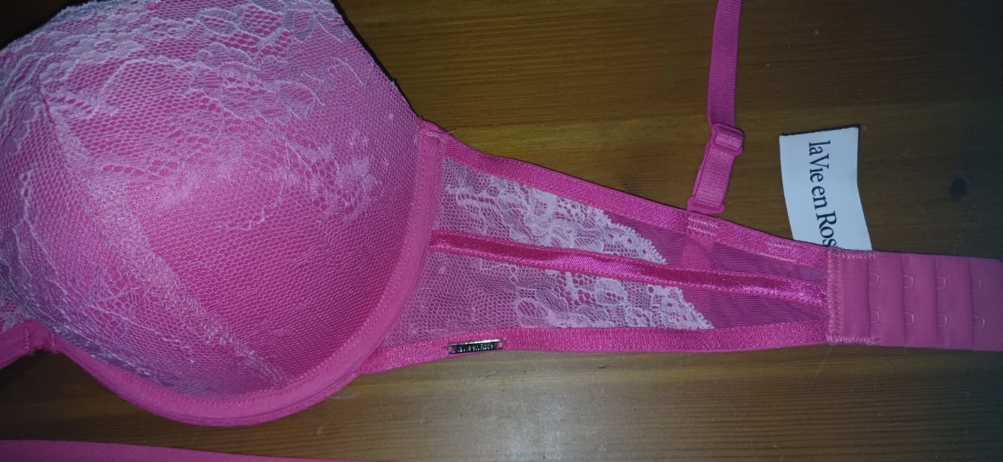 This pretty pink lace set includes a bra and matching thong. Bra features adjustable straps and a classic hook-and-eye closure. Panty has a comfortable elastic waistband with lace trim. It's a stylish addition to your lingerie collection!