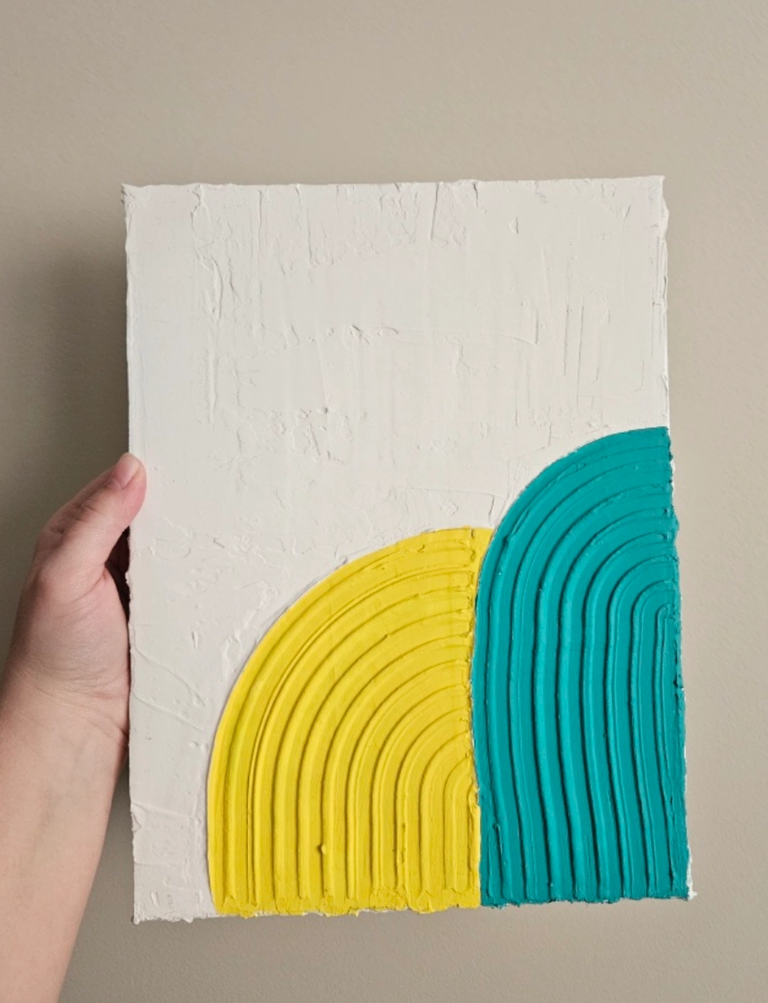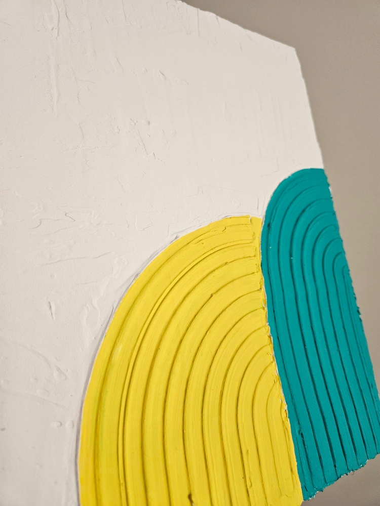 Unique abstract artwork. Yellow and teal colours. Textured paint. Modern style. Small size, perfect for any space.