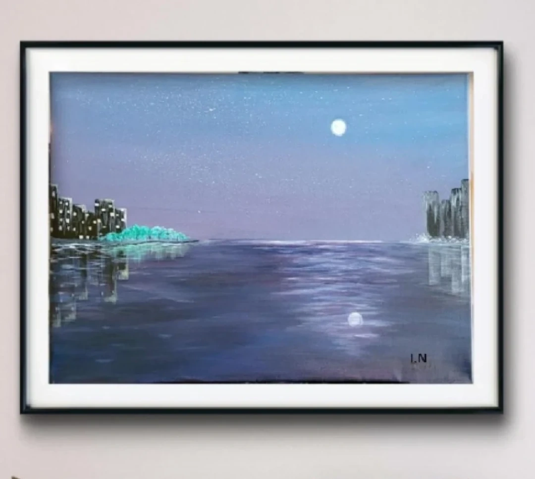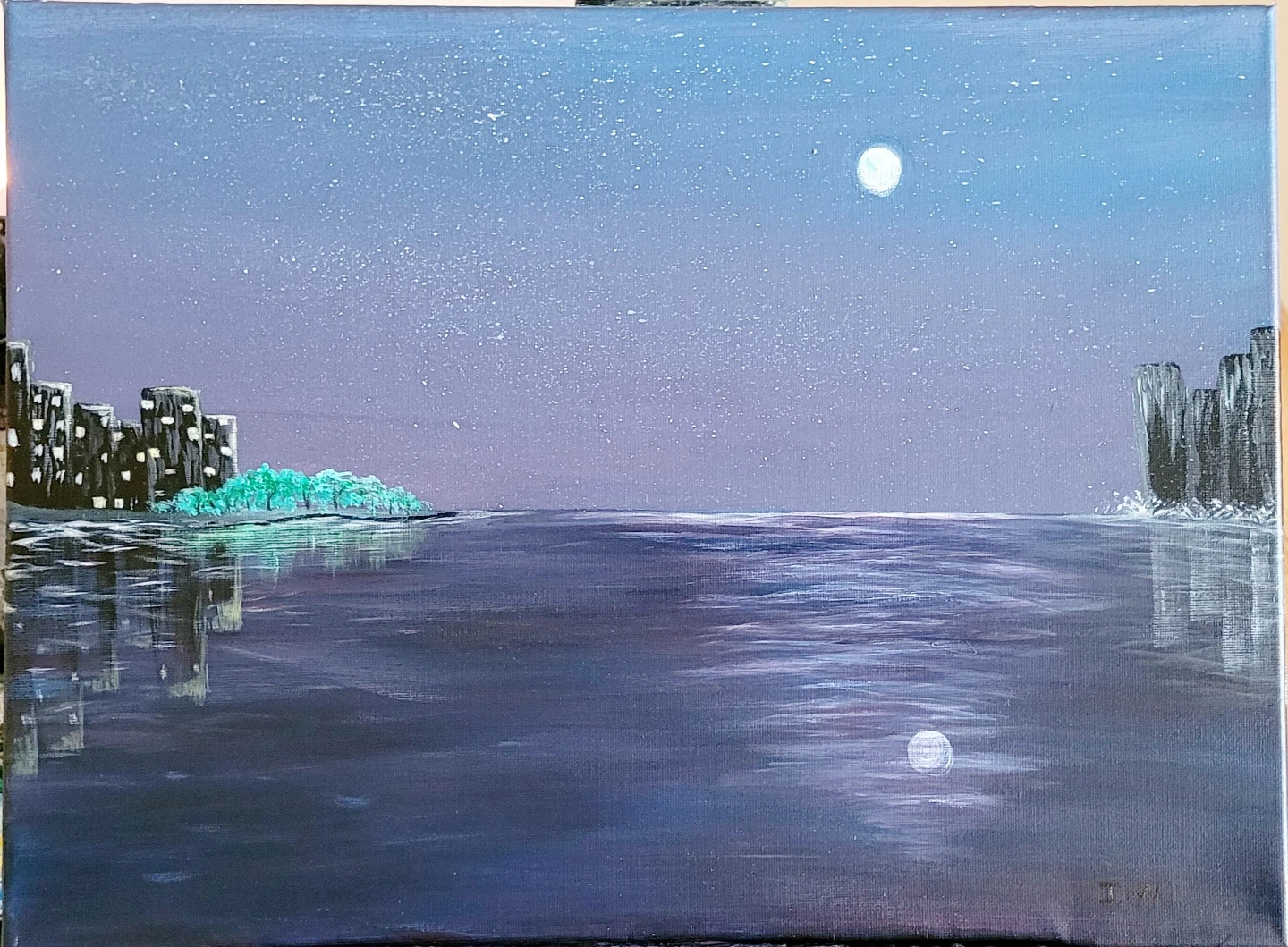 Acrylic painting of a night cityscape with a full moon and water reflections.Comes unframed. Looks great in a frame or without.