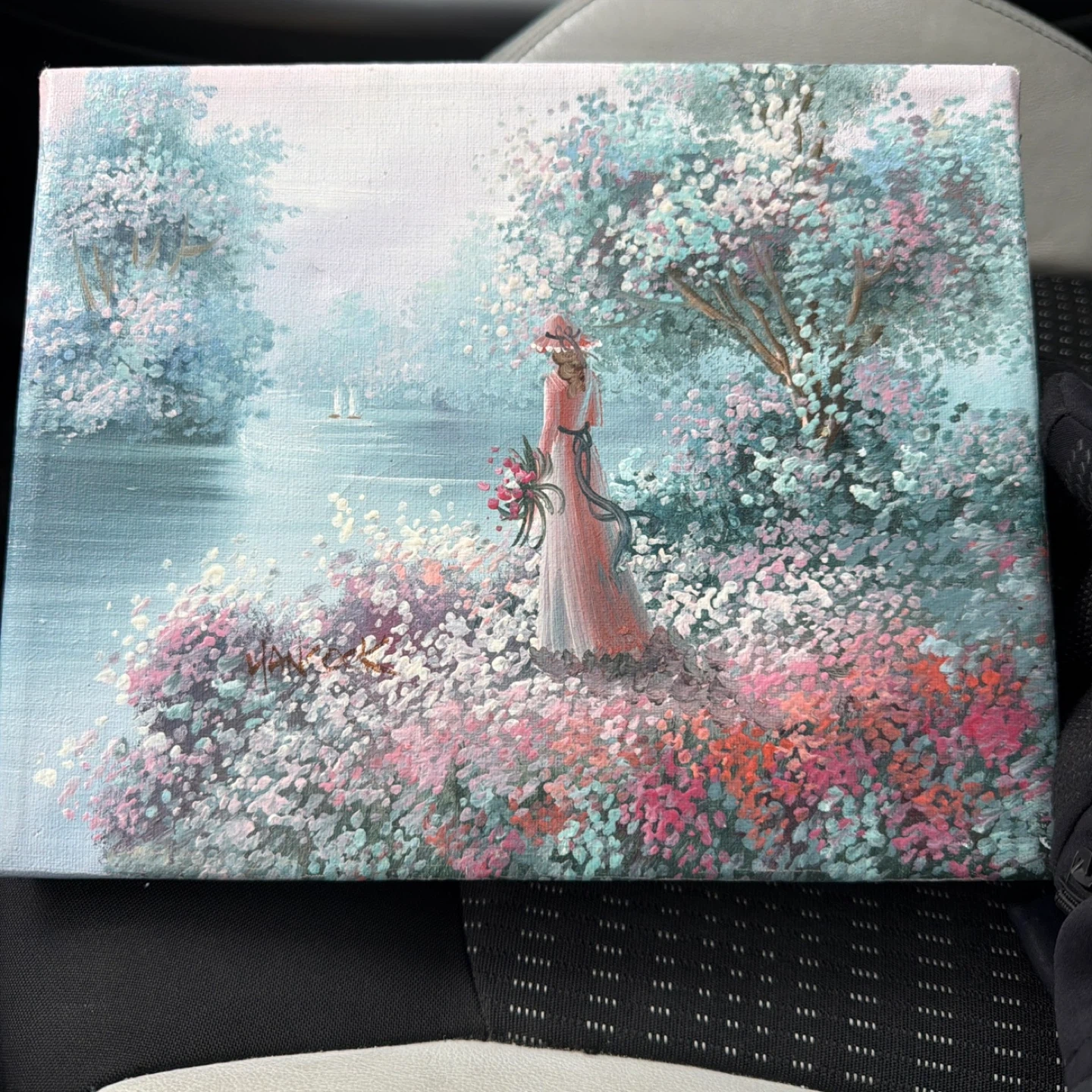 A lovely canvas painting depicting a lady in a flowing dress holding a bouquet in a vibrant garden scene. The artwork has a signature visible on the lower left. This piece adds a touch of elegance to any home decor.