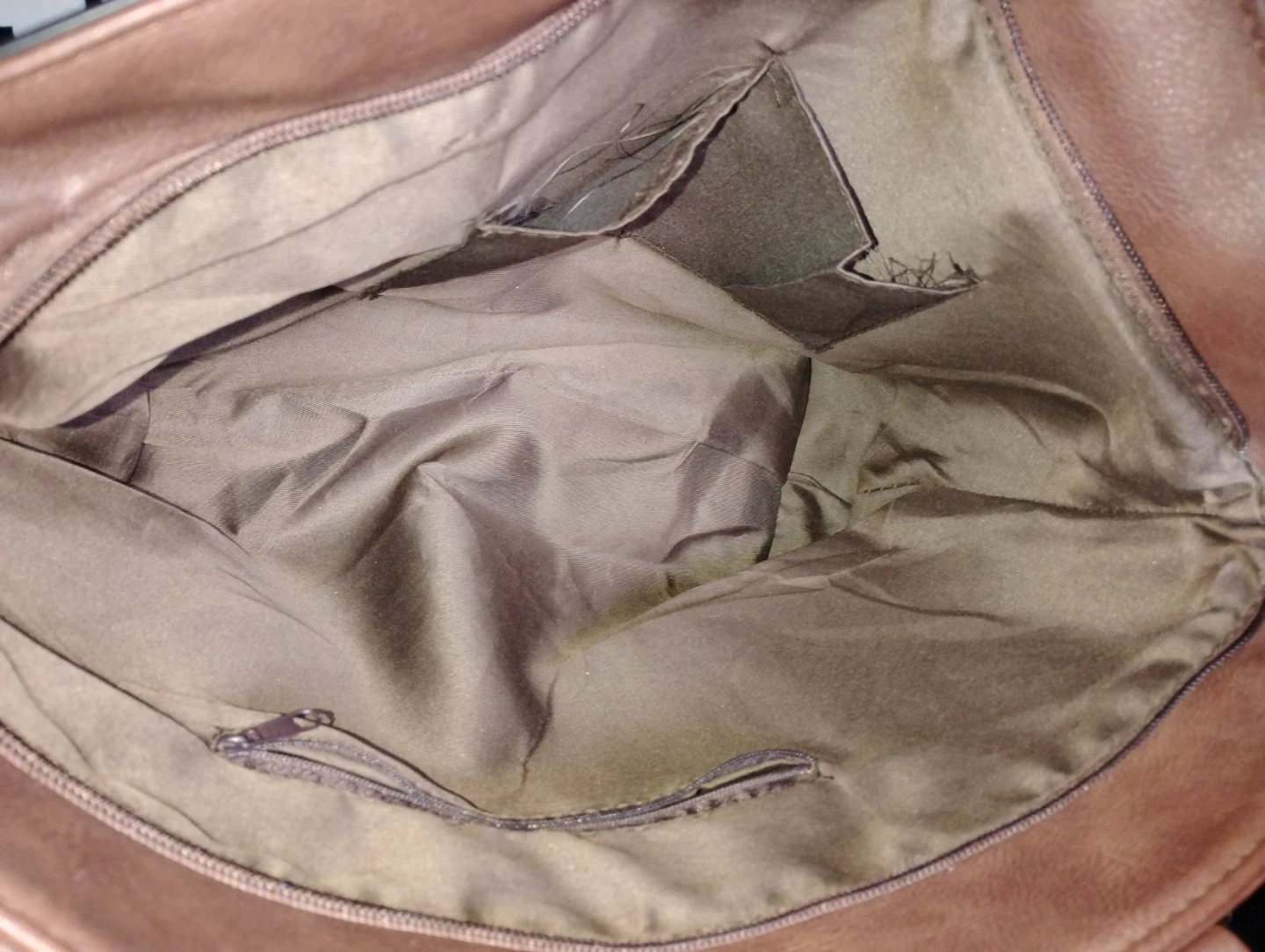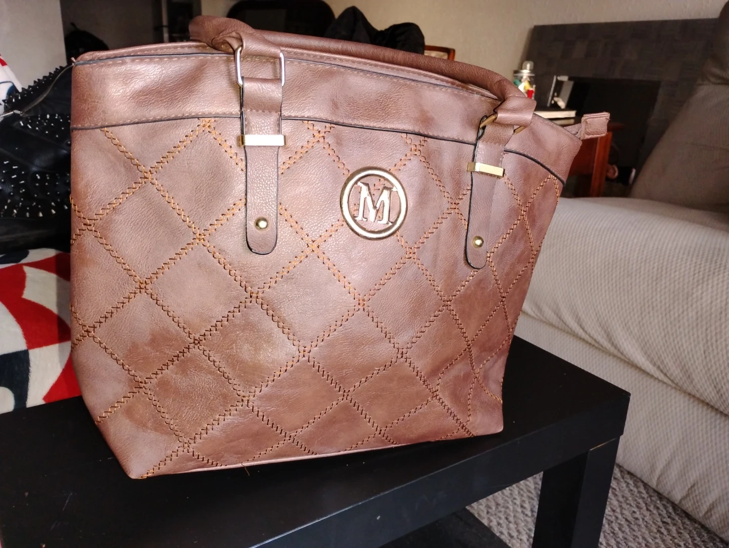 Stylish brown tote bag with quilted stitching and gold-tone hardware. It features a main zippered compartment and an interior zippered pocket. Made from faux leather material.