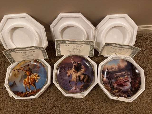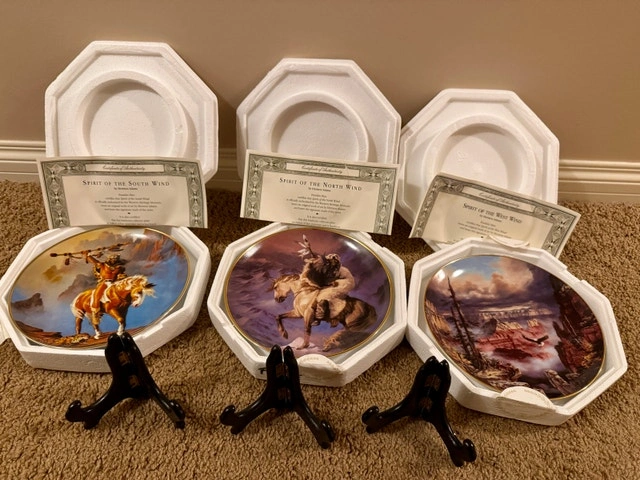 Set of 3 Franklin Mint Spirit of the West by Hermon Adams. Excellent condition. Includes Certificates of Authenticity. In original packaging. Bonus 3 plate stands. Asking $35 Cochrane.