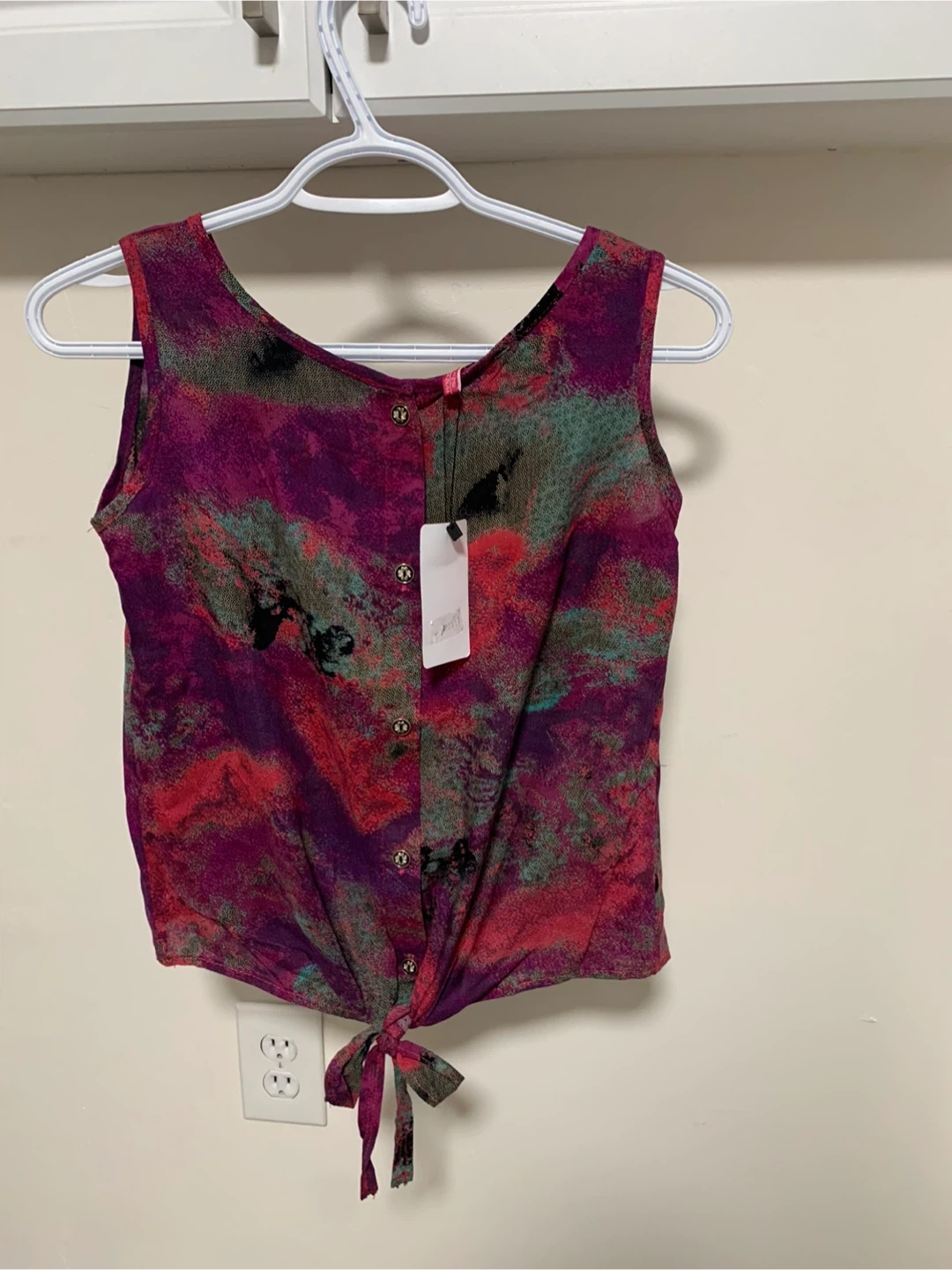 Here's a cute tie-front sleeveless cotton top! It features a unique purple and pink pattern. Perfect for warmer weather! BNWT