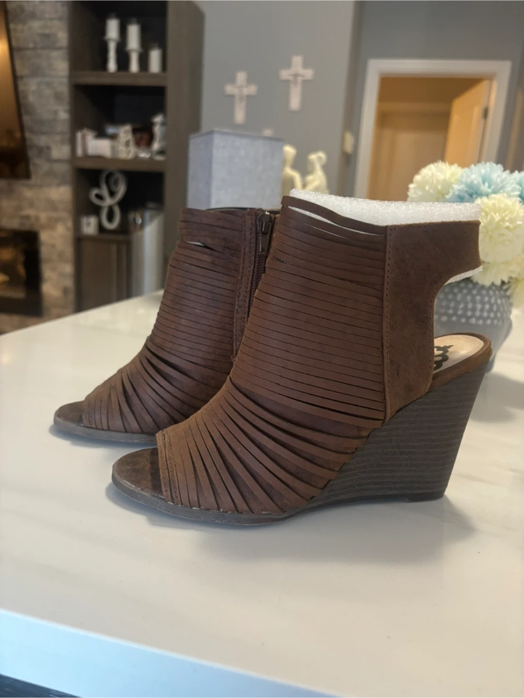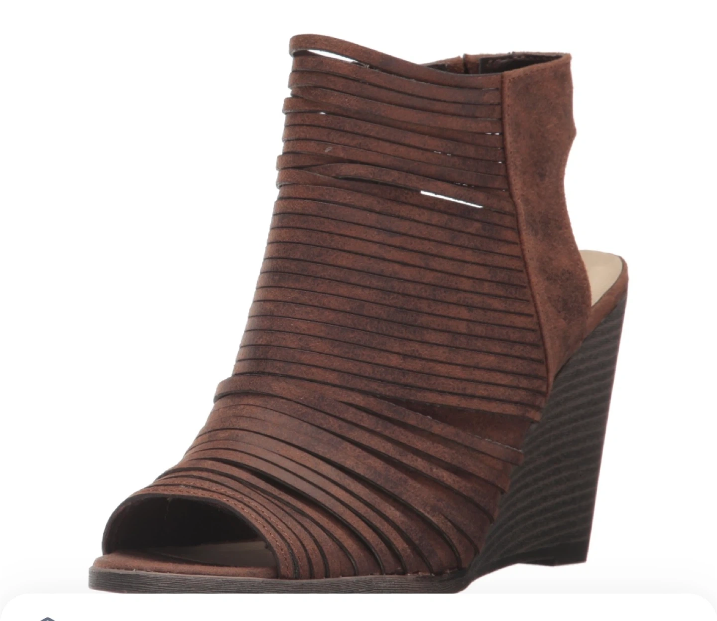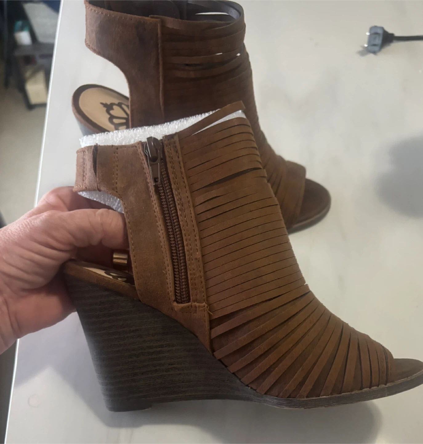 Woven peep toe wedge with open heel and side zip, smooth lining, cushioning insole for all-day comfort. traction outsole.