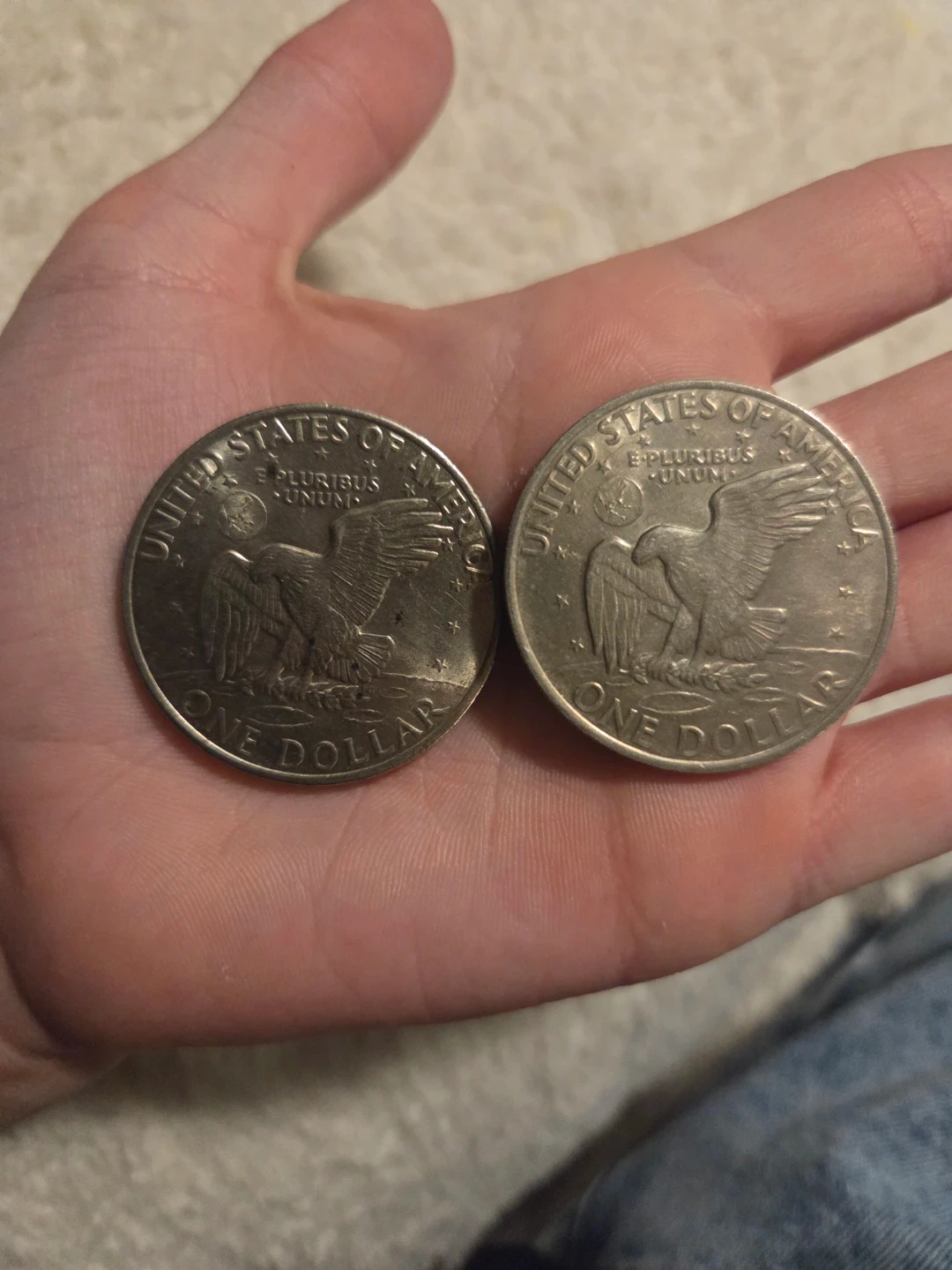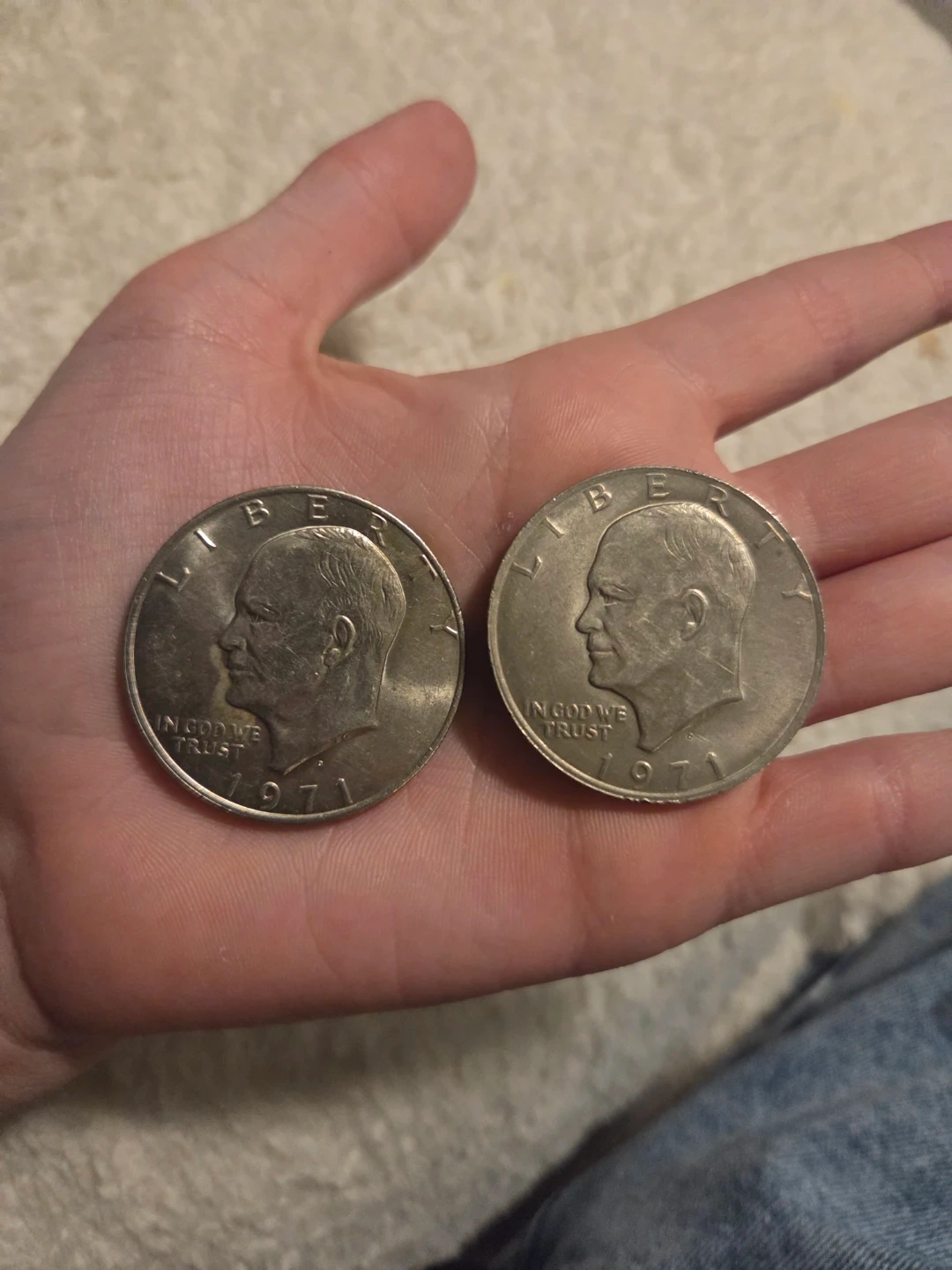 Selling two 1971 Eisenhower dollar coins. Each coin is made of a silver-colored metal. These are collectible coins from the United States. Might be interesting for collectors!