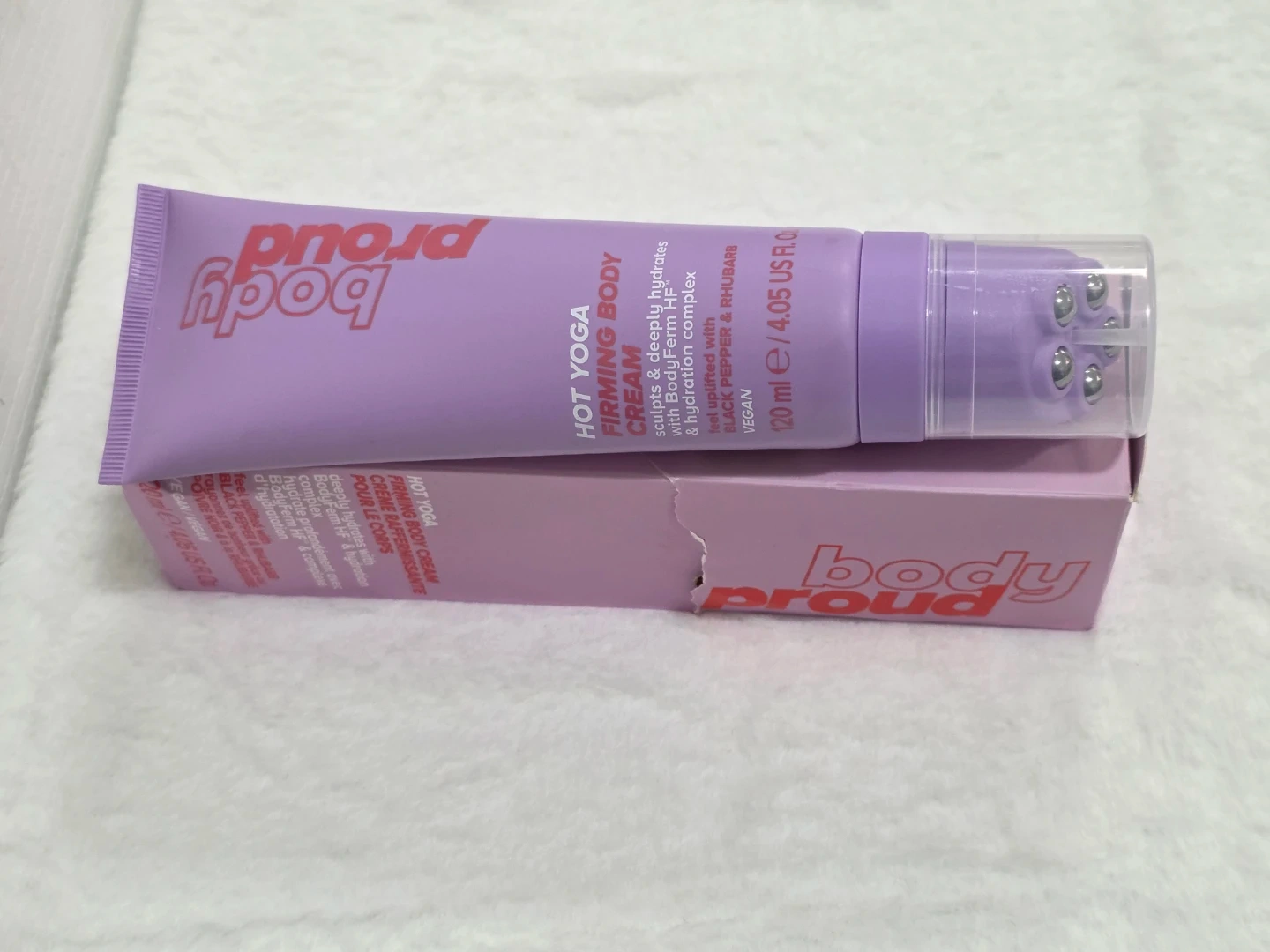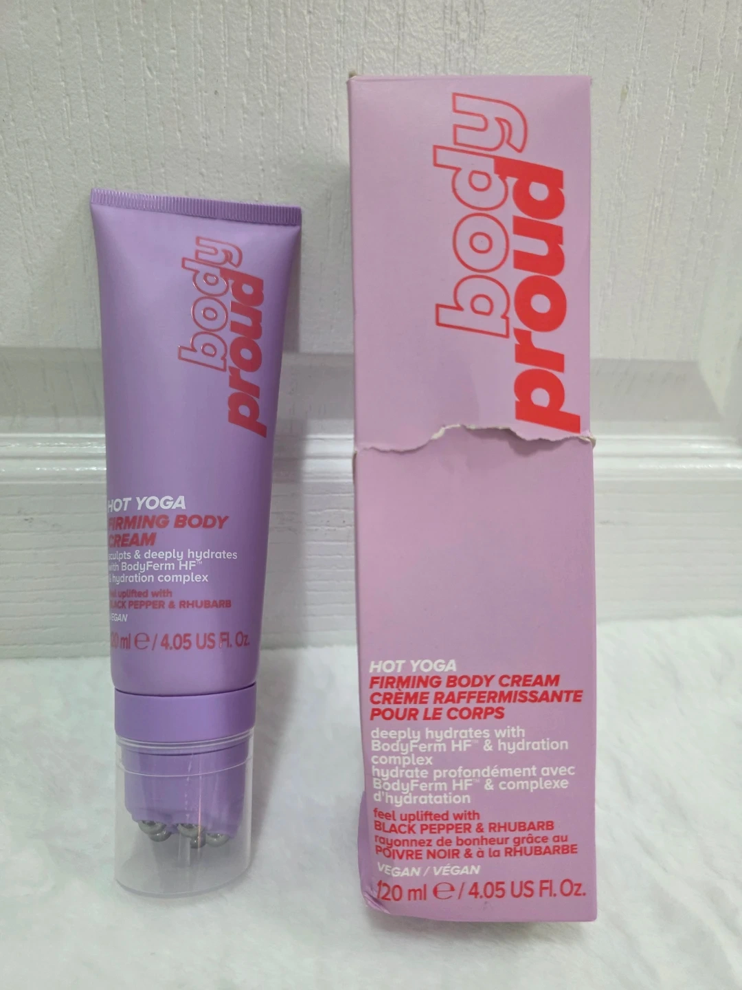 This Brand NEW Body Proud Hot Yoga Firming Body Cream sculpts and deeply hydrates. It's formulated with BodyFirm HF & hydration complex, and feels uplifted with black pepper & rhubarb. It's a vegan formula that comes in a 120 ml bottle.