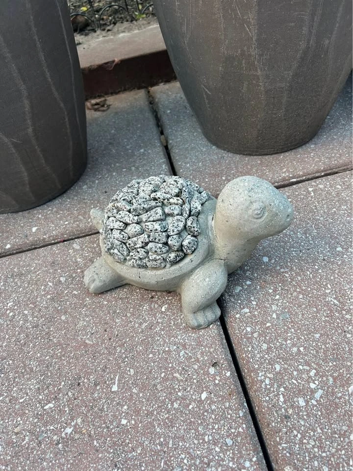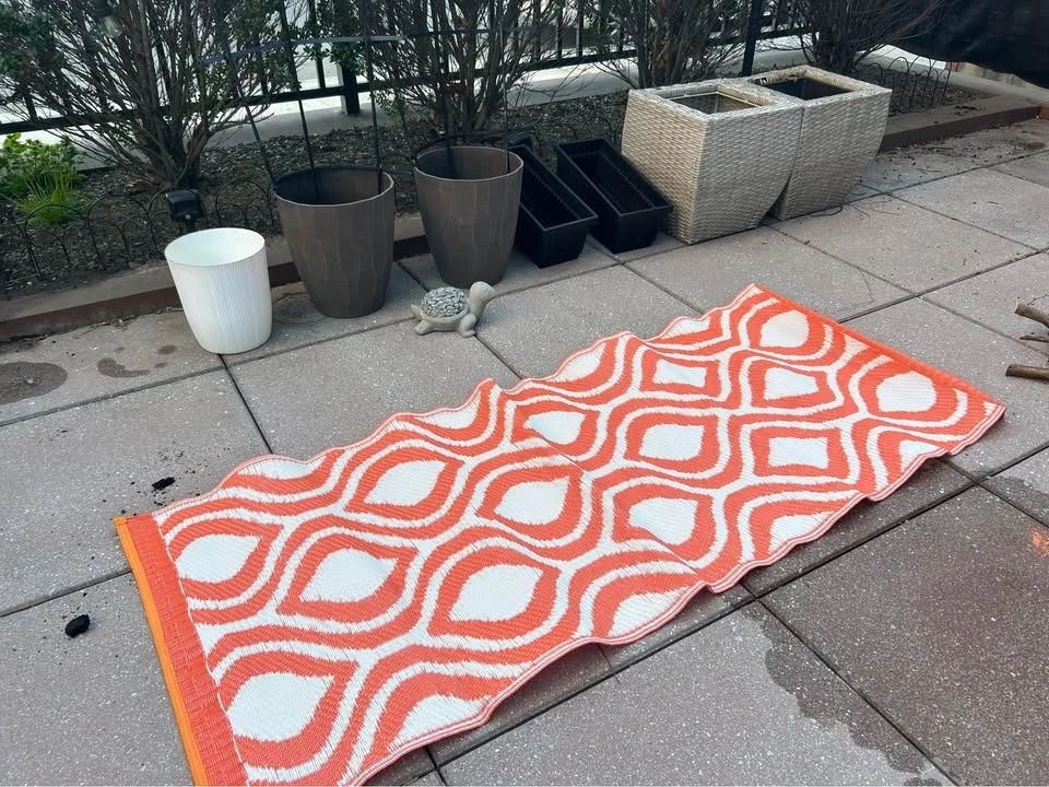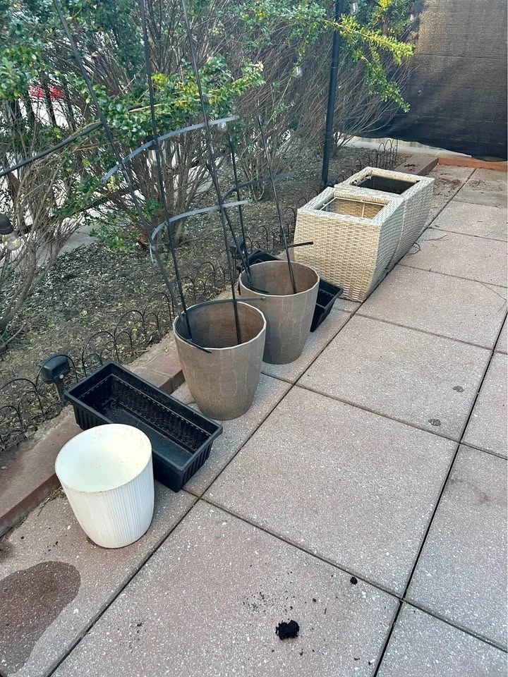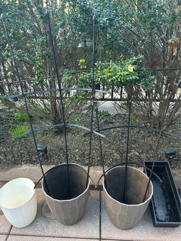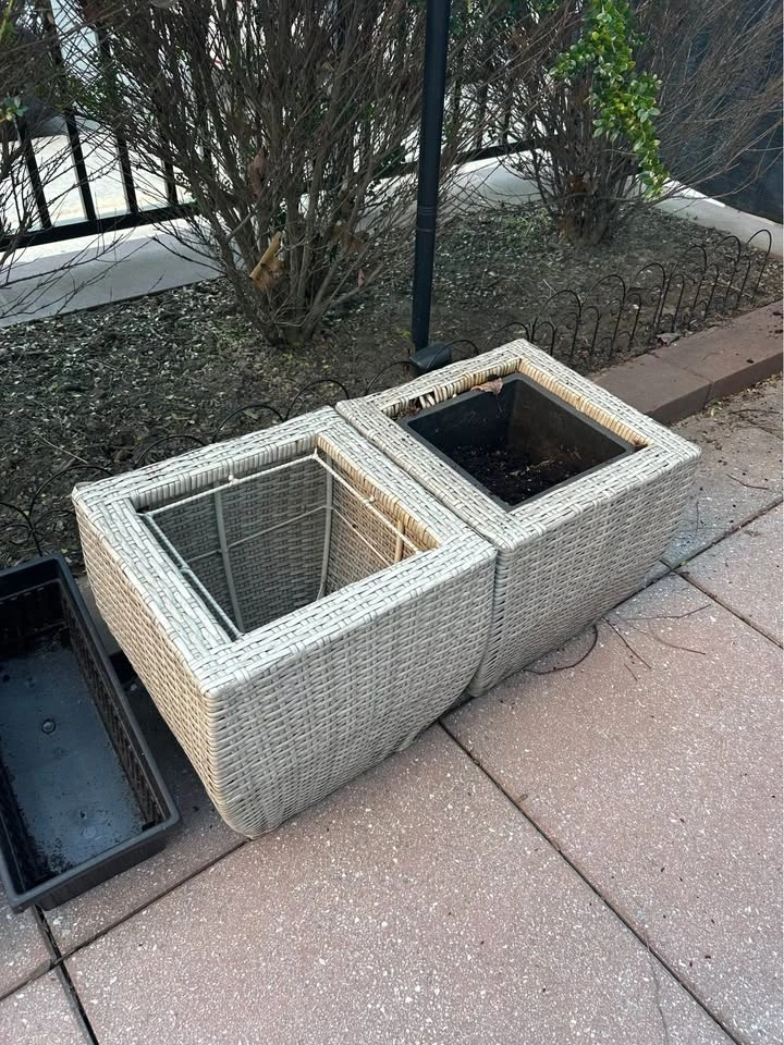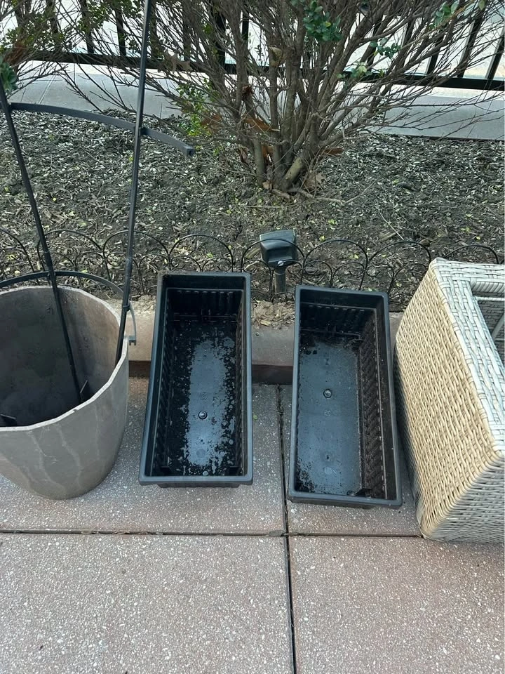 Assorted outdoor planters and pots available. Includes two big grey pots with plastic/metal trellises (comes with extra pieces), a white ribbed plastic pot, two black rectangular planter boxes, and two light woven planter boxes (one doesn’t have an insert). Also includes one cement turtle for garden decoration and one orange and white plastic rug (easy to rinse off and lightweight). Great for your plants or herbs on the patio or in the garden.