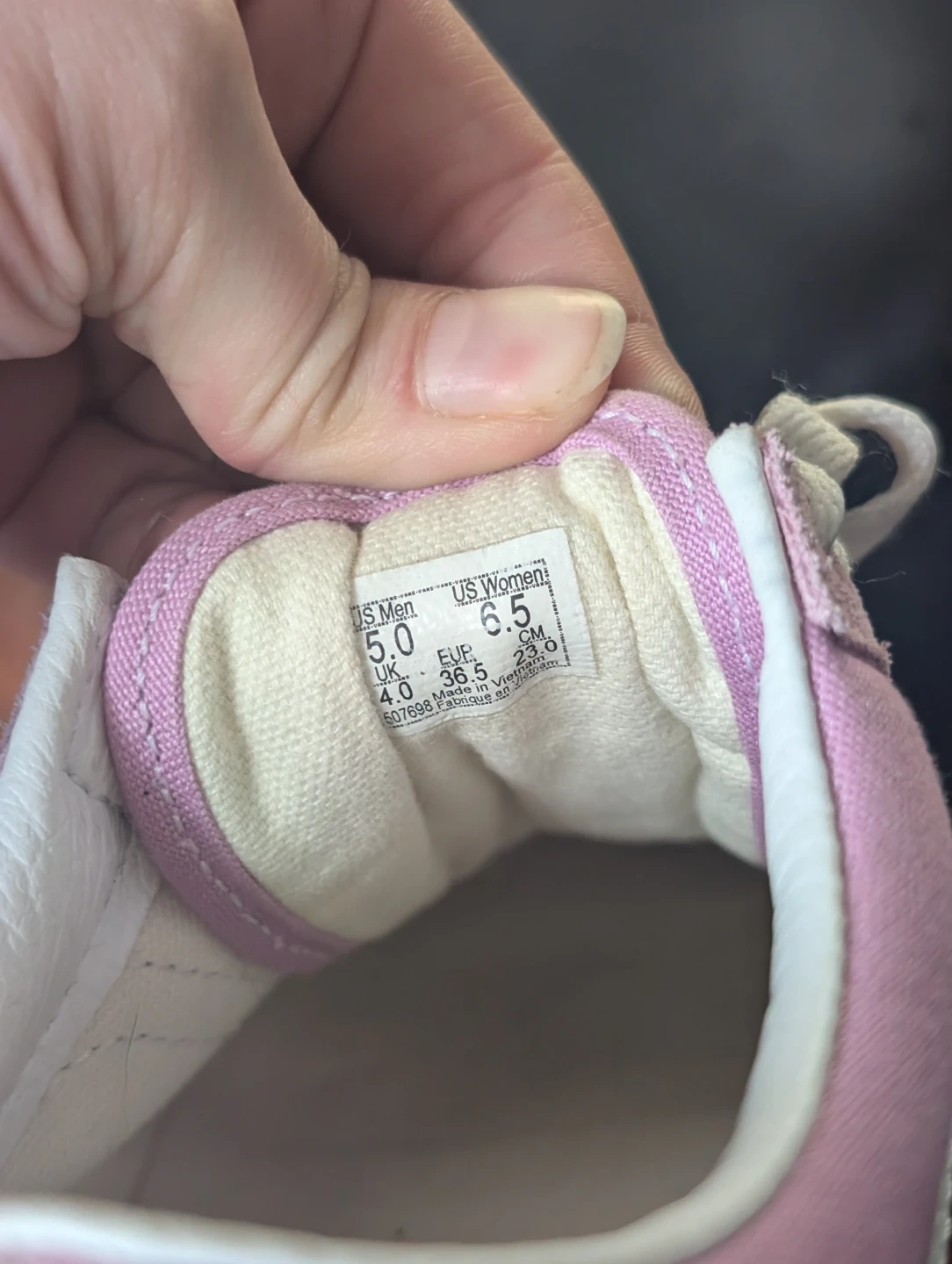 These are pink Vans Old Skool sneakers with suede and canvas uppers. They're a women's size 6.5 (US). Features the classic Vans side stripe and waffle sole.