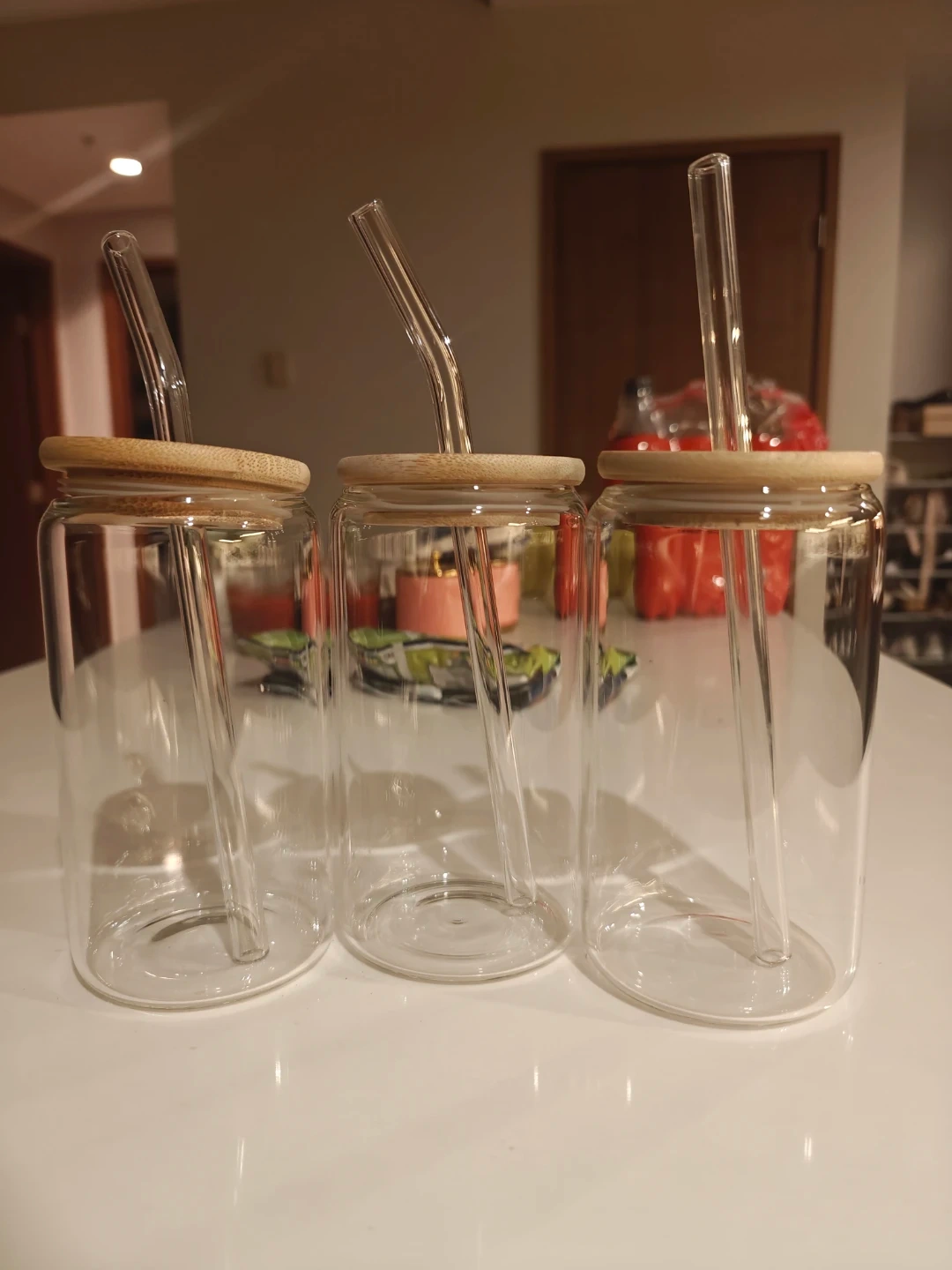 Brand new glass tumblers, come with reusable bamboo lids and glass straws.