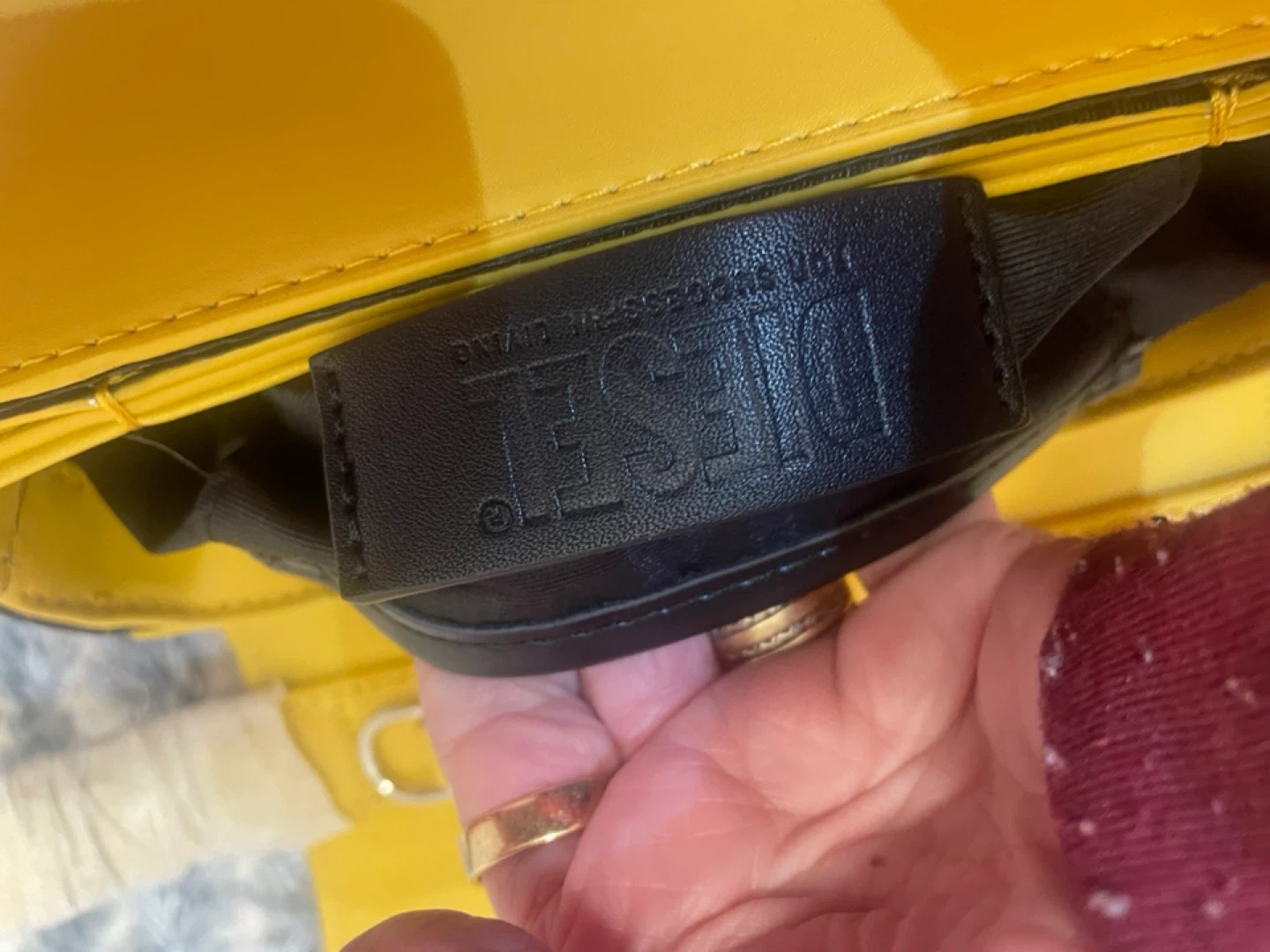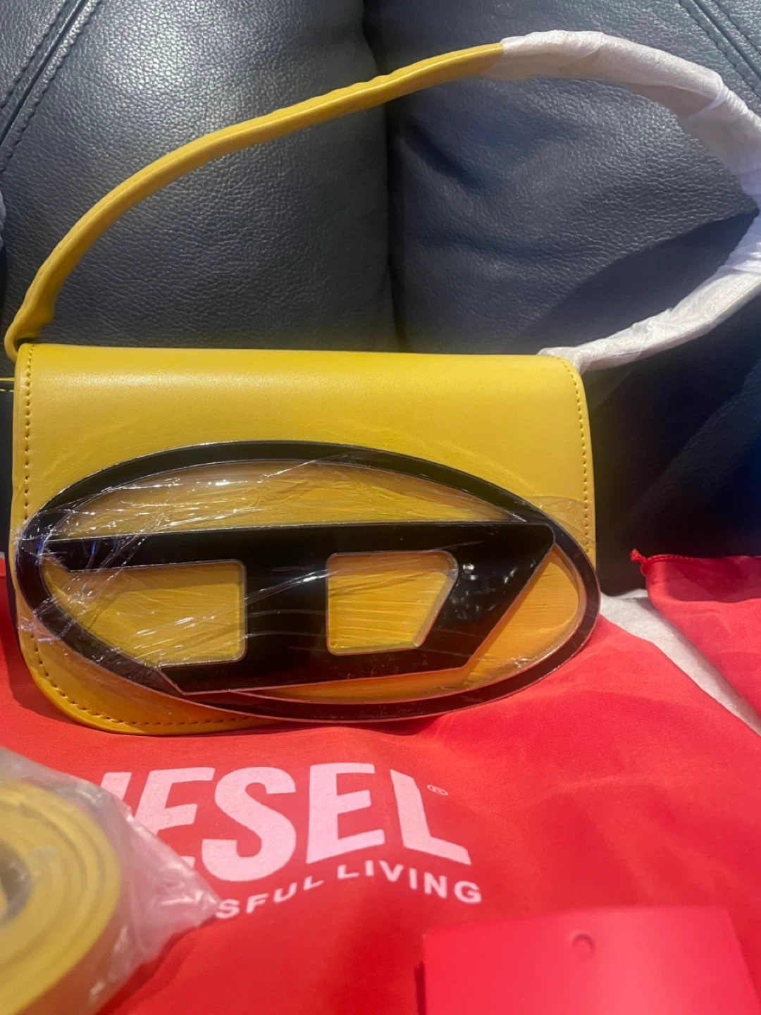 Two Diesel shoulder bags, one in yellow and one in bright blue. Both bags feature the signature Diesel logo on the front. They're made of leather and come with dust bags. Includes detachable straps.