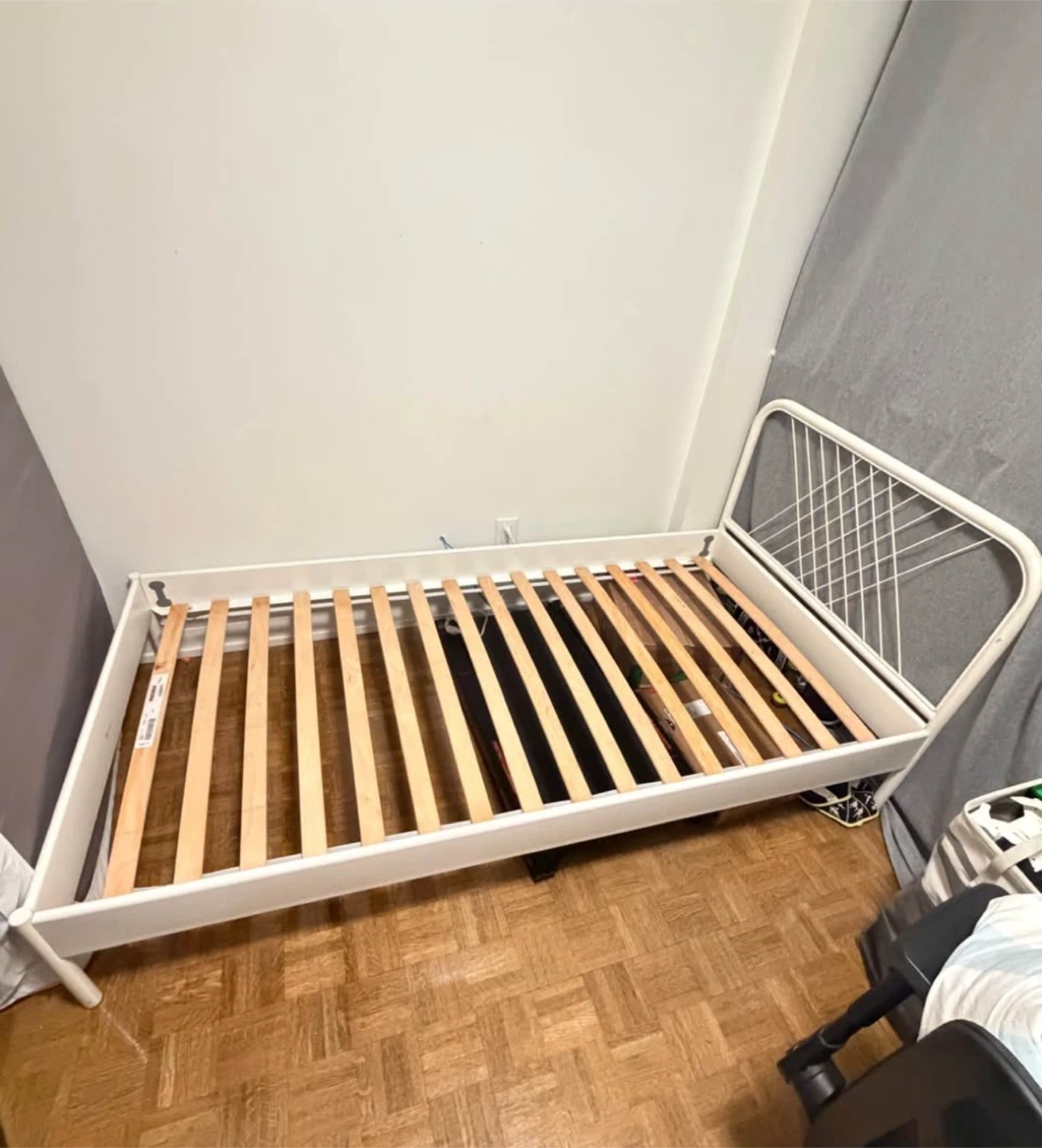 This is a white IKEA Twin bed frame. It has a metal headboard with a geometric design. Slatted bed base included. Mattress NOT included.