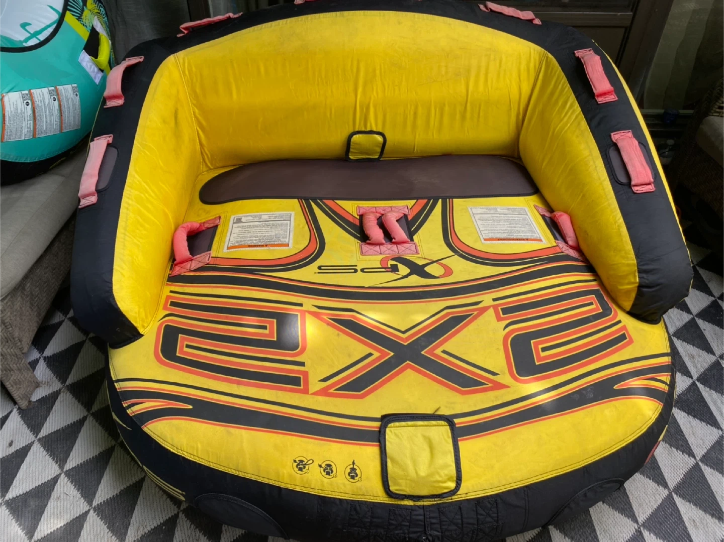 Get ready for some fun on the water with this XPS 2EX2 inflatable towable tube! It features a vibrant yellow and black design and is perfect for a day of tubing with friends and family