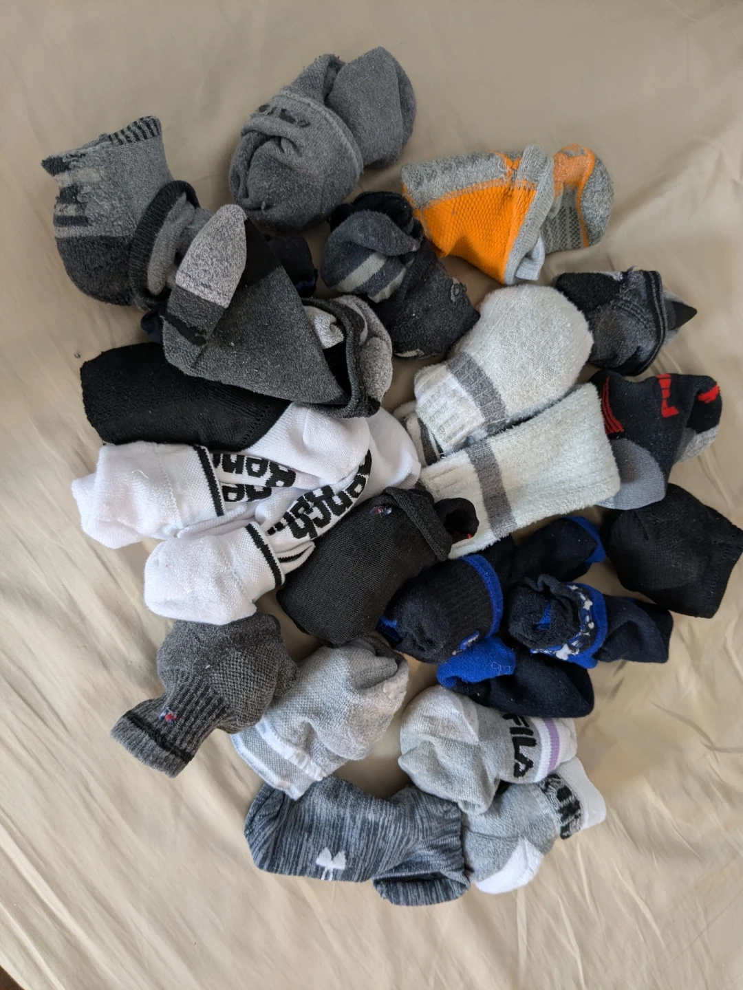 Bundle of assorted socks, including brands like Puma and Fila. Mostly ankle socks in various colours and patterns. Perfect for everyday wear or sports activities!