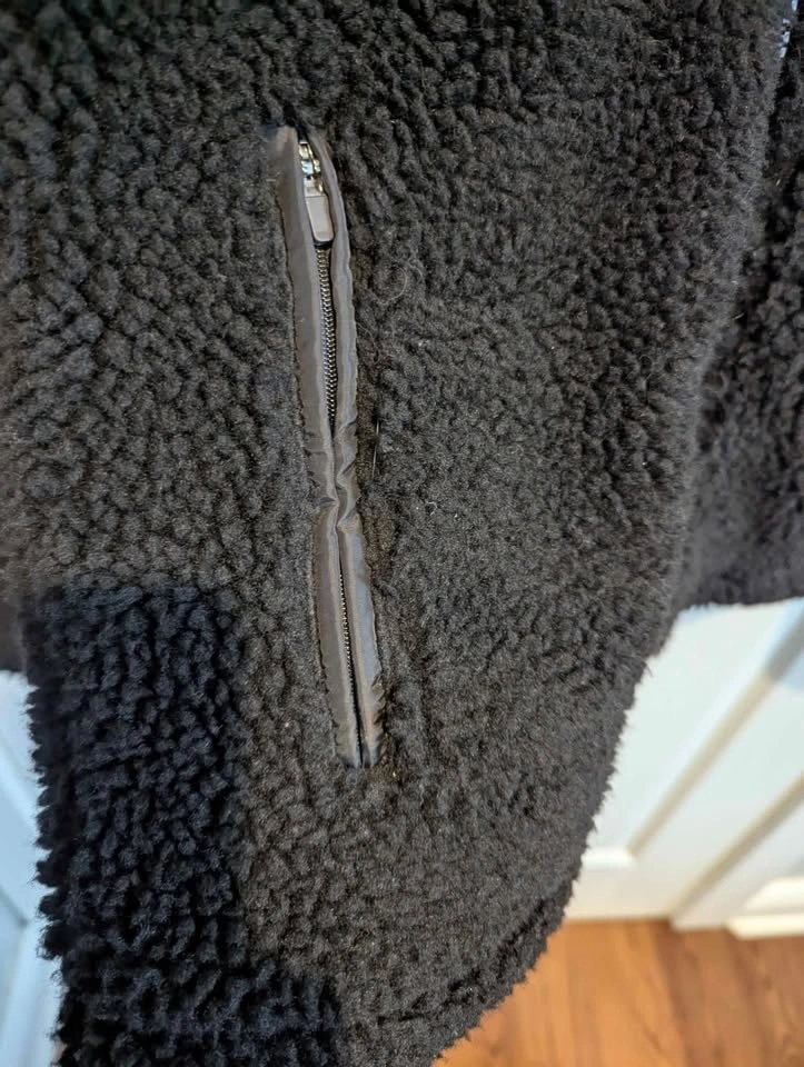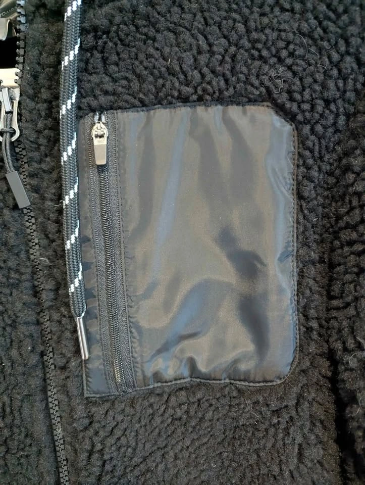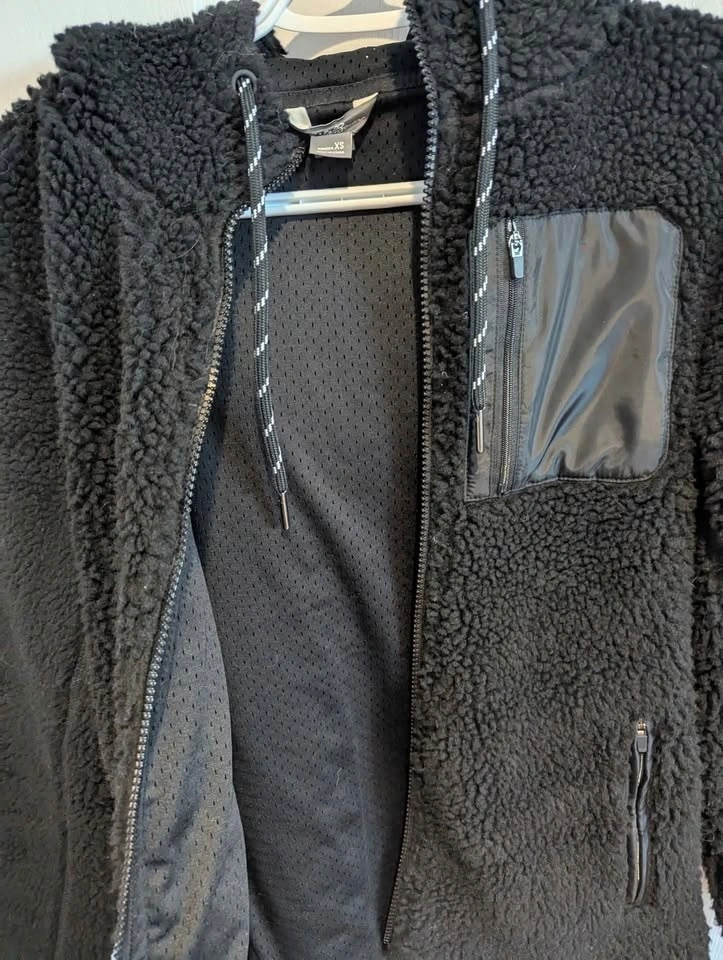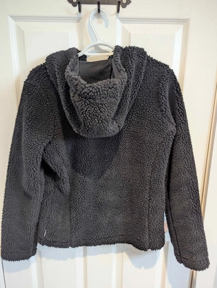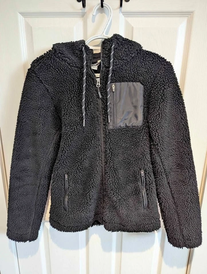 Cozy black sherpa jacket with zip-up front. Features a hood and zippered pockets. Excellent condition, worn once. Torso length: 26 inches, Chest: 20 inches, Hips: 21 inches, Sleeve length: 22 inches.