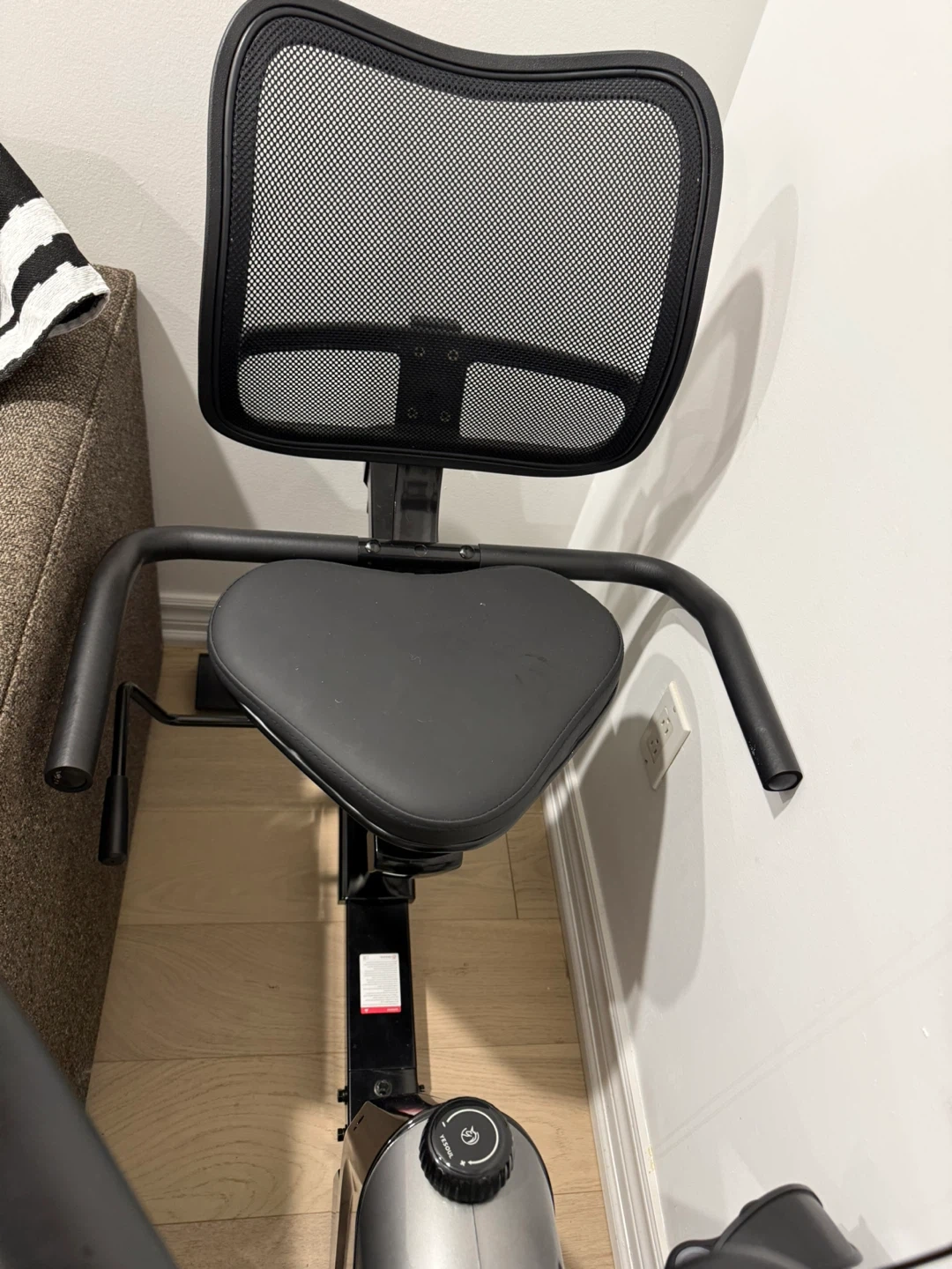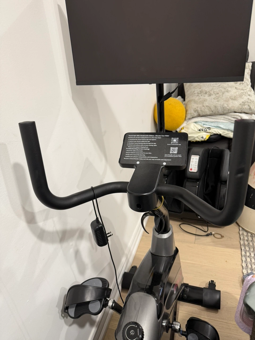 This YESOUL stationary exercise bike features a comfortable mesh back seat and adjustable handlebars. It comes with a screen and power adapter. Great for home workouts!