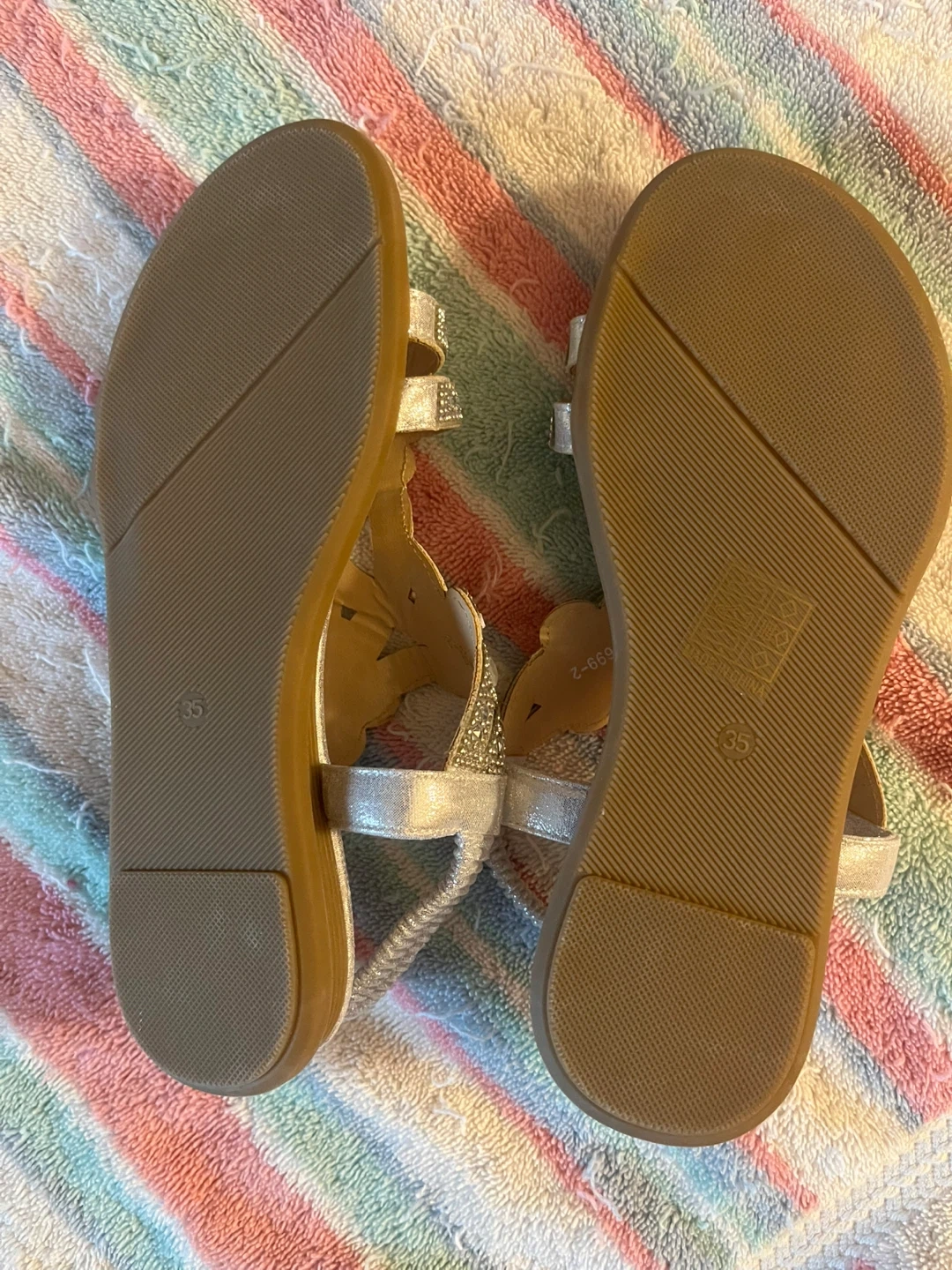 These YASST sandals are a sparkly silver colour, perfect for dressy occasions. They feature beautiful rhinestone embellishments on the straps. Size 5.