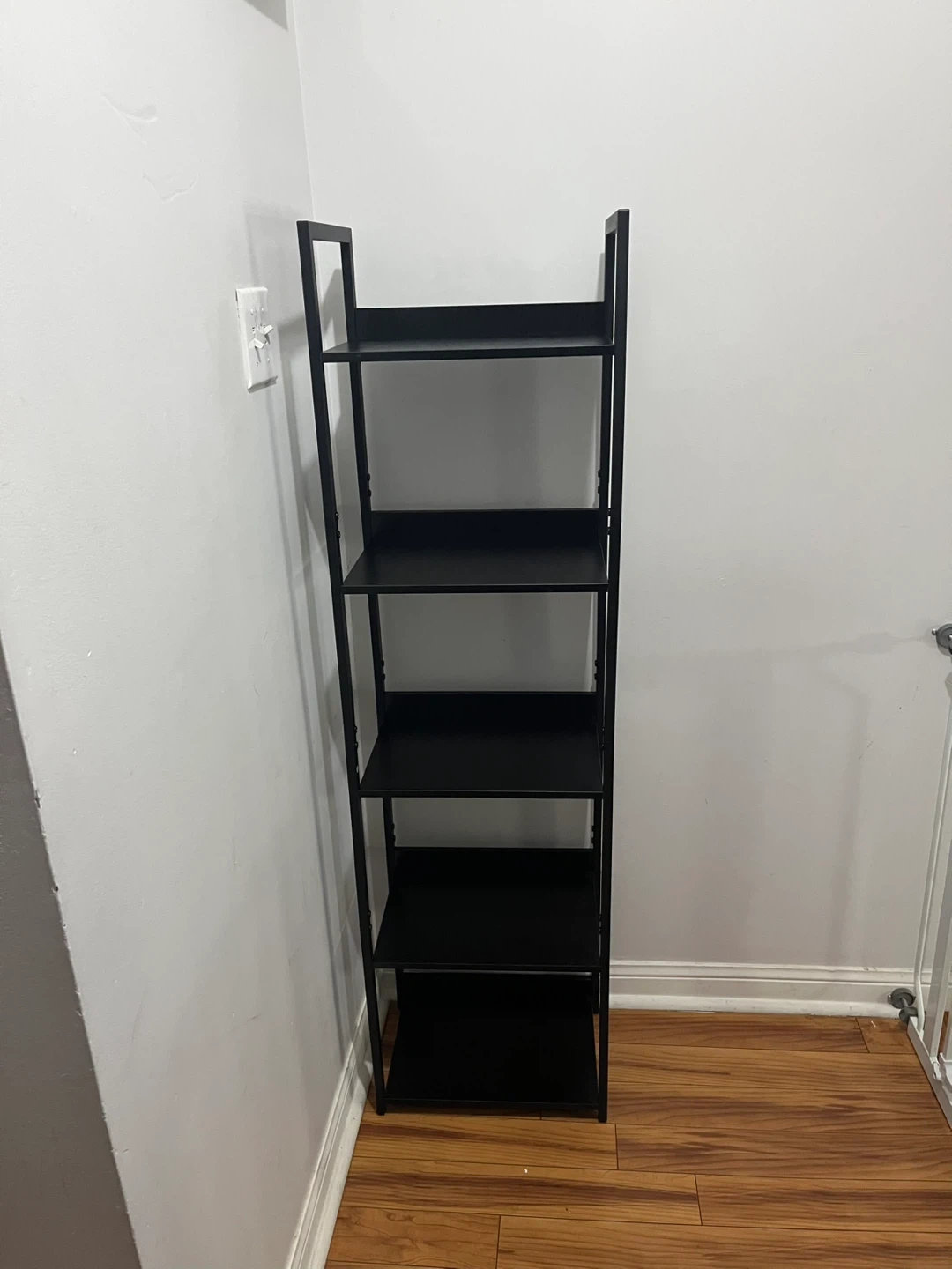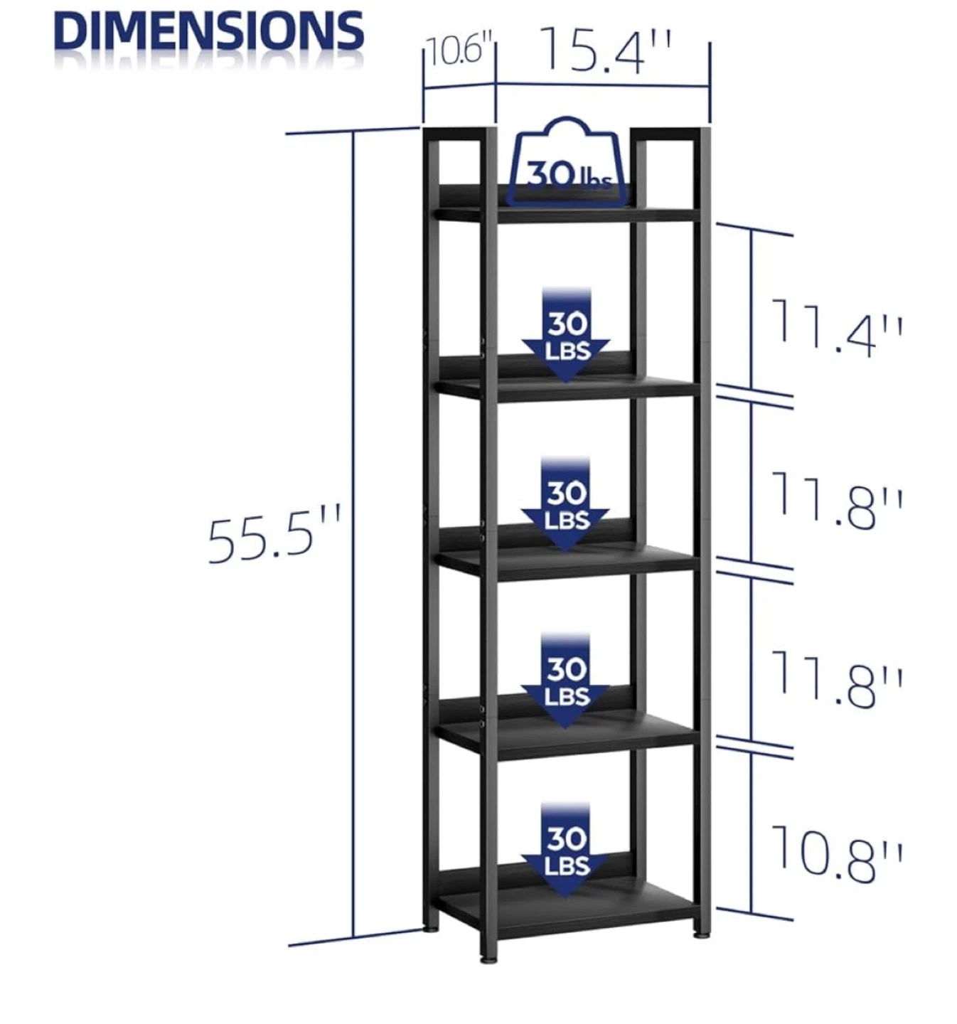 This 5-tier black metal bookcase offers ample storage space. Each shelf supports up to 30 lbs. Its dimensions are 15.4"W x 10.6"D x 55.5"H. It's perfect for organizing books and decor.