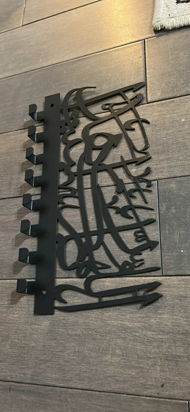 Black metal wall-mounted key holder featuring intricate Islamic calligraphy. It has eight hooks for organizing keys. A decorative piece for any entryway or hallway.