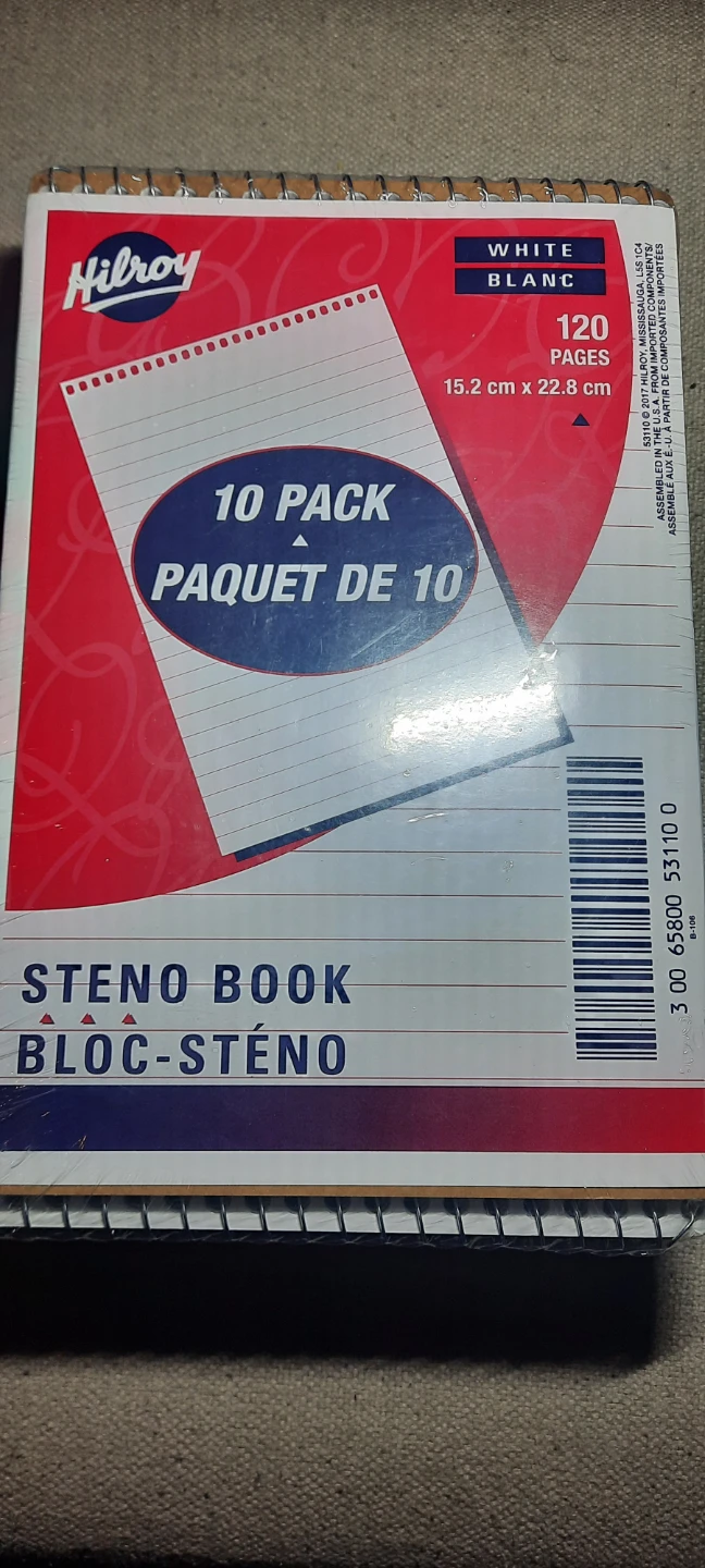 Ten pack of Hilroy steno notebooks. Each notebook has 120 pages and measures 15.2 cm by 22.8 cm. White paper with centre line ruling.