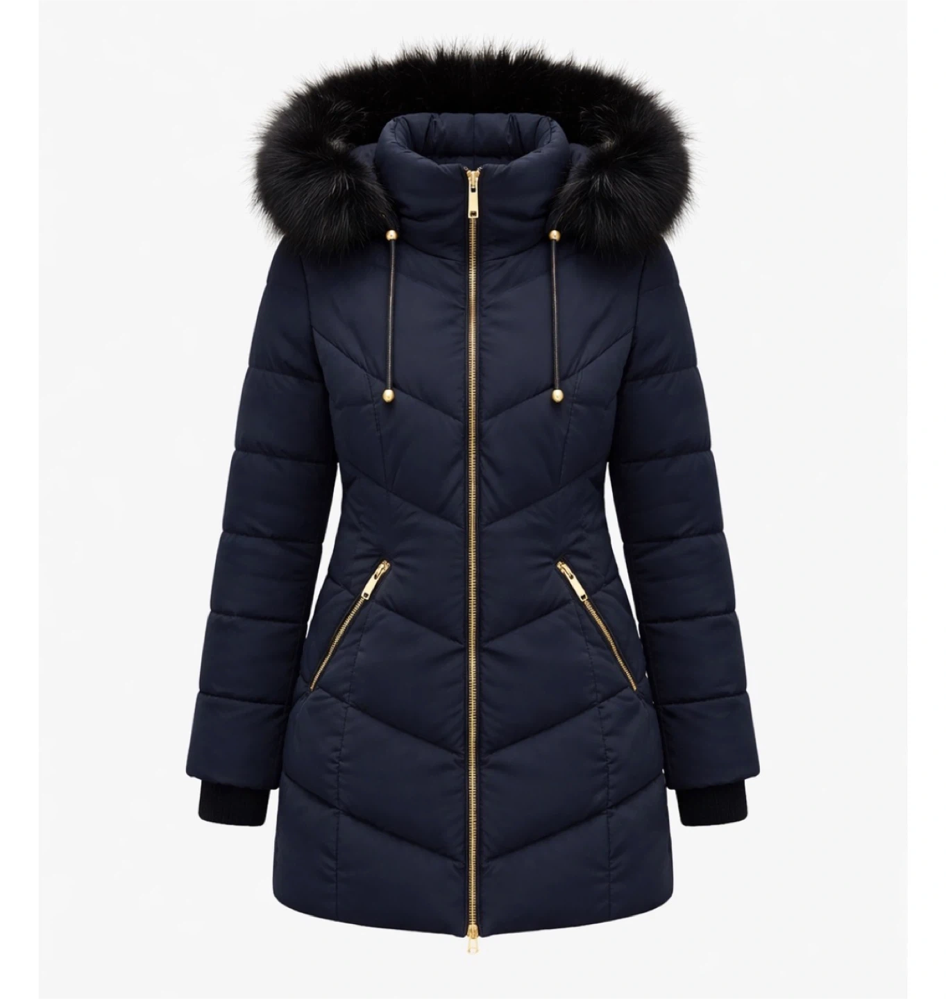 This navy blue puffer coat is designed for warmth and style. It features a chevron quilting pattern and gold-tone zipper accents. The hood is trimmed with faux fur for added coziness.