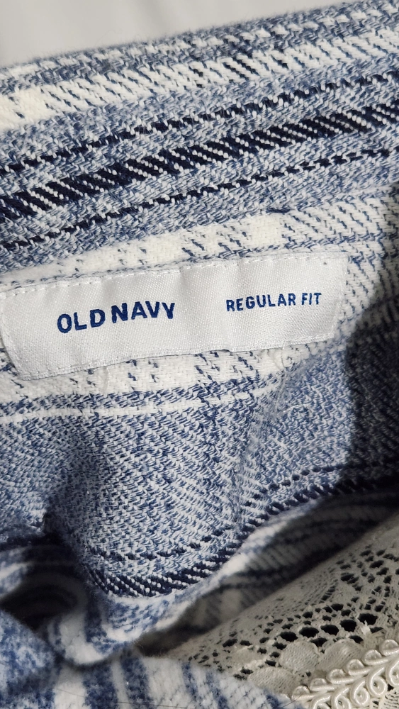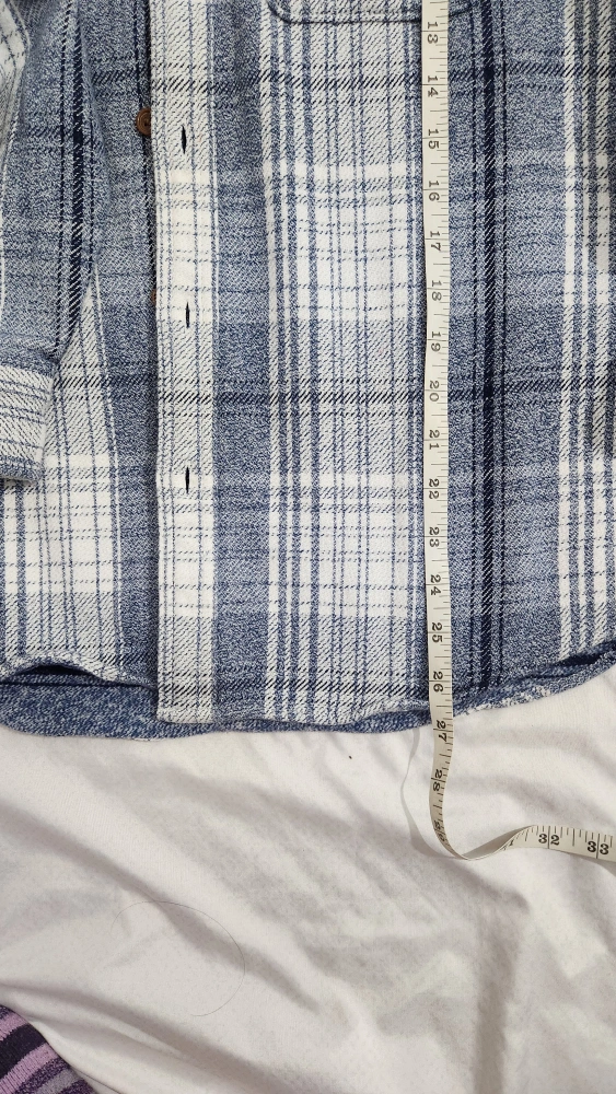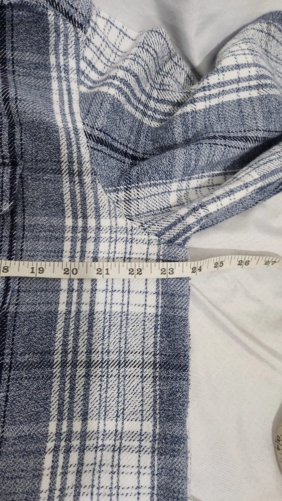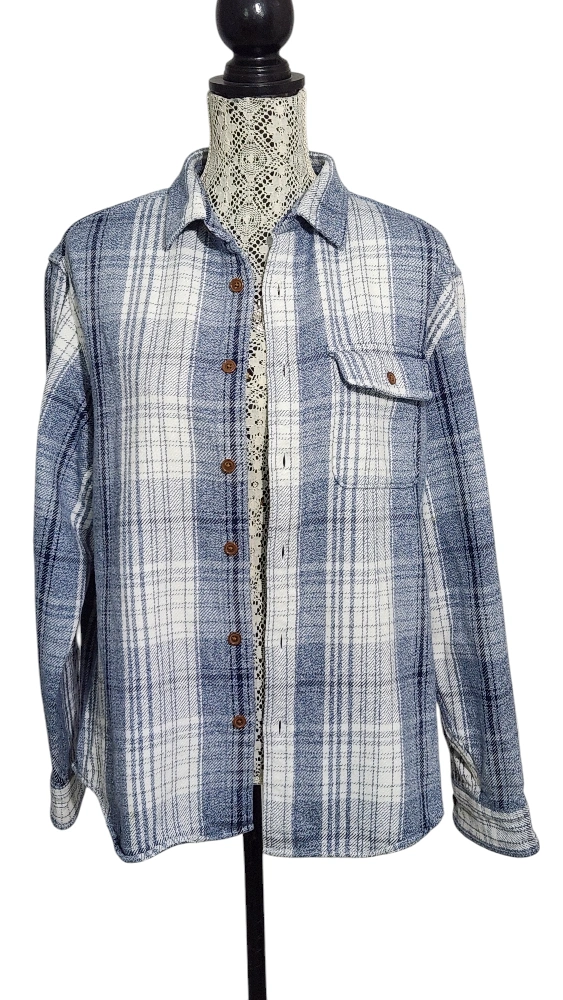 Blue and white plaid long sleeve flannel shirt. Regular fit.