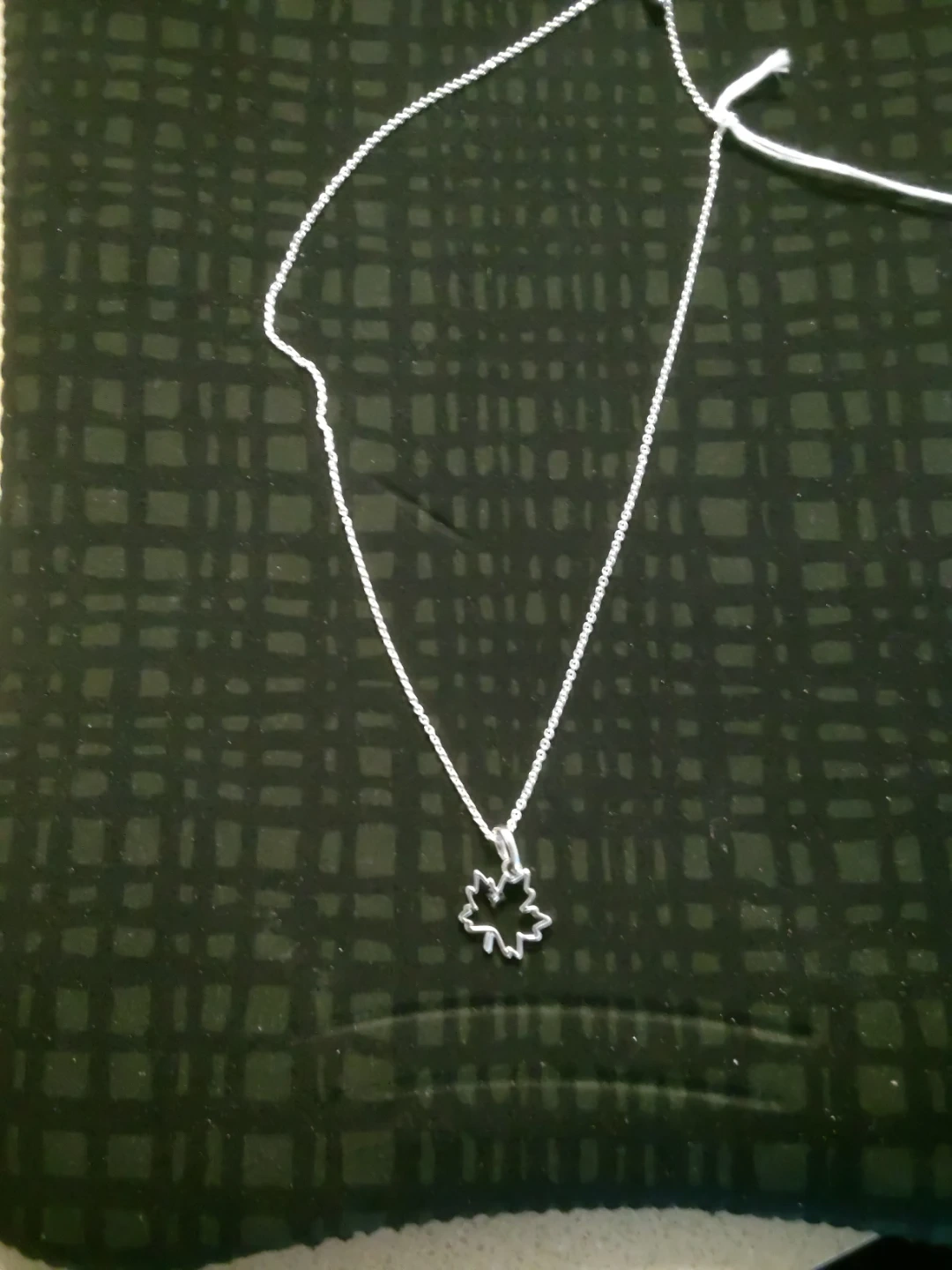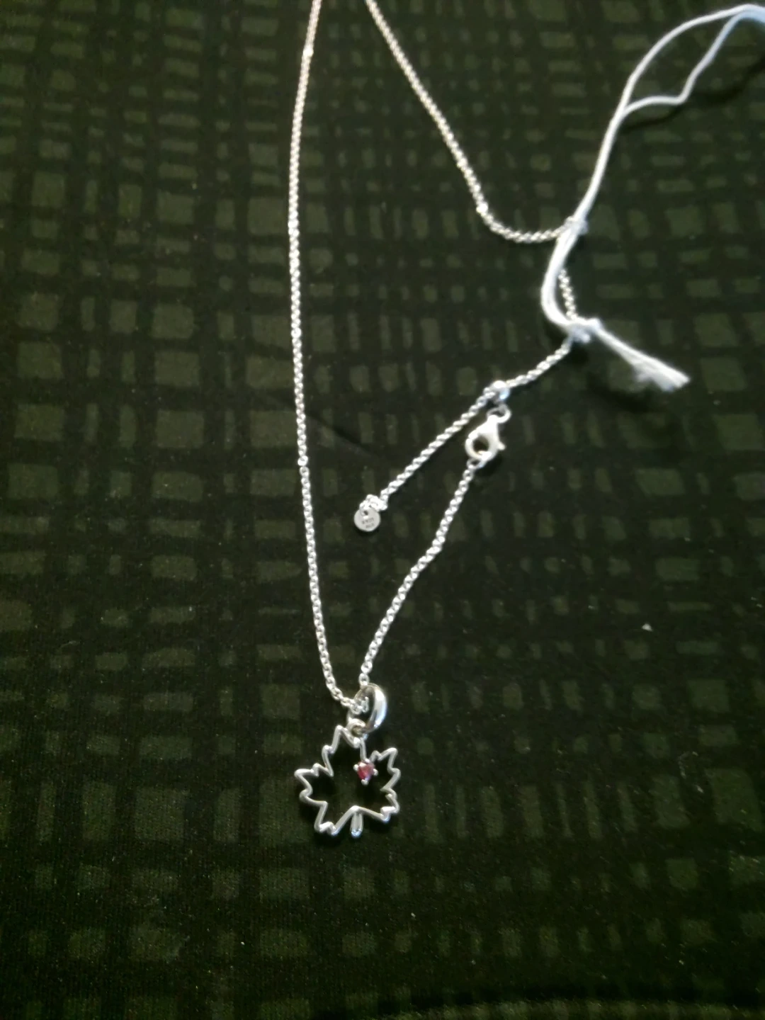 Pandora silver 925 necklace features a charming maple leaf pendant with a small red accent stone. It has an adjustable chain and a secure clasp. It's a lovely piece for everyday wear or to add a touch of nature to your outfit!
